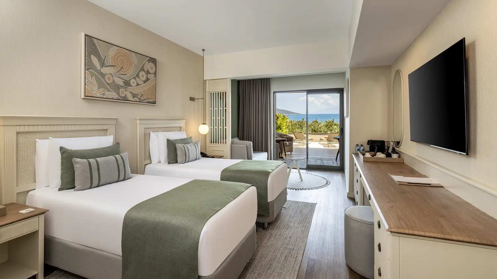 Dla max. 3 osób, Przestrzeń zewnętrzna: Taras, Kanały telewizji: Angielski, Telefon w pokoju, prysznic, Powierzchnia pokoju: ok. 26 - 30 m2, Dostawka: łóżko rozkładane, Rodzaj podłogi: laminat, Sprzątanie cykliczne, 1 sypialnia, Maksymalna liczba osób dorosłych: 3, Maksymalna liczba dzieci: 2, Widok na morze, Liczba łazienek: 1, Liczba toalet: 1, Zestaw do parzenia kawy i herbaty, Klimatyzacja: Klimatyzacja centralna, Działa w godzinach: 24hMaj, Czerwiec, Lipiec, Sierpień, Wrzesień, Październik