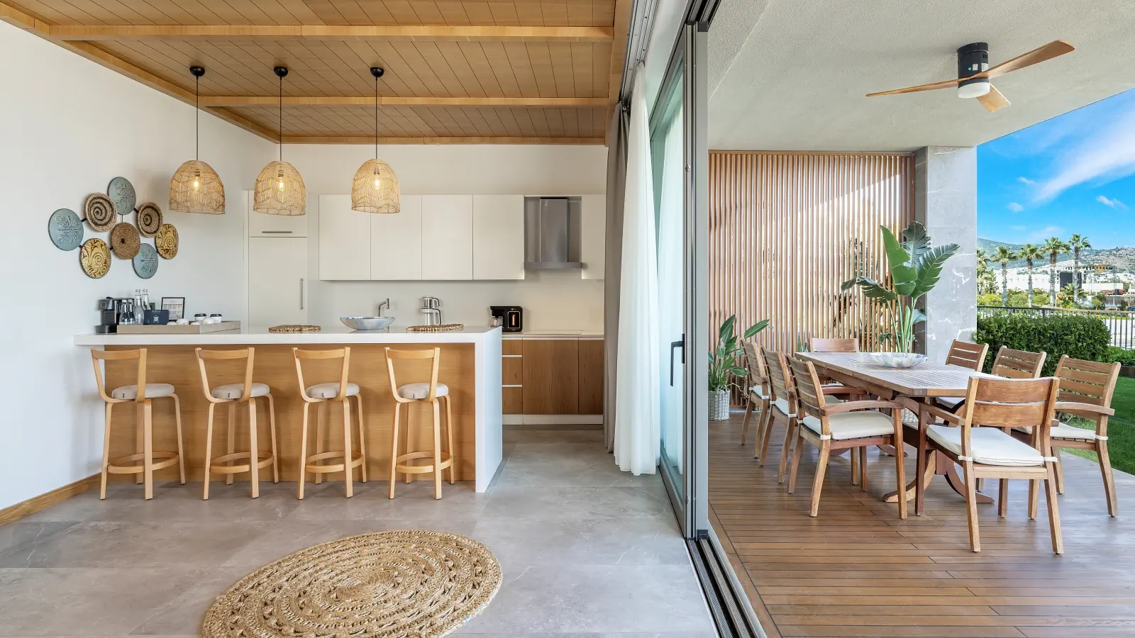 Dla max. 5 osób, Przestrzeń zewnętrzna: Balkon i taras, Kanały telewizji: Angielski, Telefon w pokoju, Aneks kuchenny, prysznic, Powierzchnia pokoju: ok. 105 m2, Dostawka: łóżko standardowe, Rodzaj podłogi: laminat, Sprzątanie cykliczne, Salon, część jadalniana, 2 sypialnie, Drzwi łączące między pokojami, Maksymalna liczba osób dorosłych: 5, Maksymalna liczba dzieci: 4, Kwiaty i owoce, Widok na morze, Wyjście do wspólnego basenu, Liczba łazienek: 2, Liczba toalet: 2, Kuchenka mikrofalowa, Zestaw do parzenia kawy i herbaty, Klimatyzacja: Klimatyzacja centralna, Działa w godzinach: 24hMaj, Czerwiec, Lipiec, Sierpień, Wrzesień, Październik