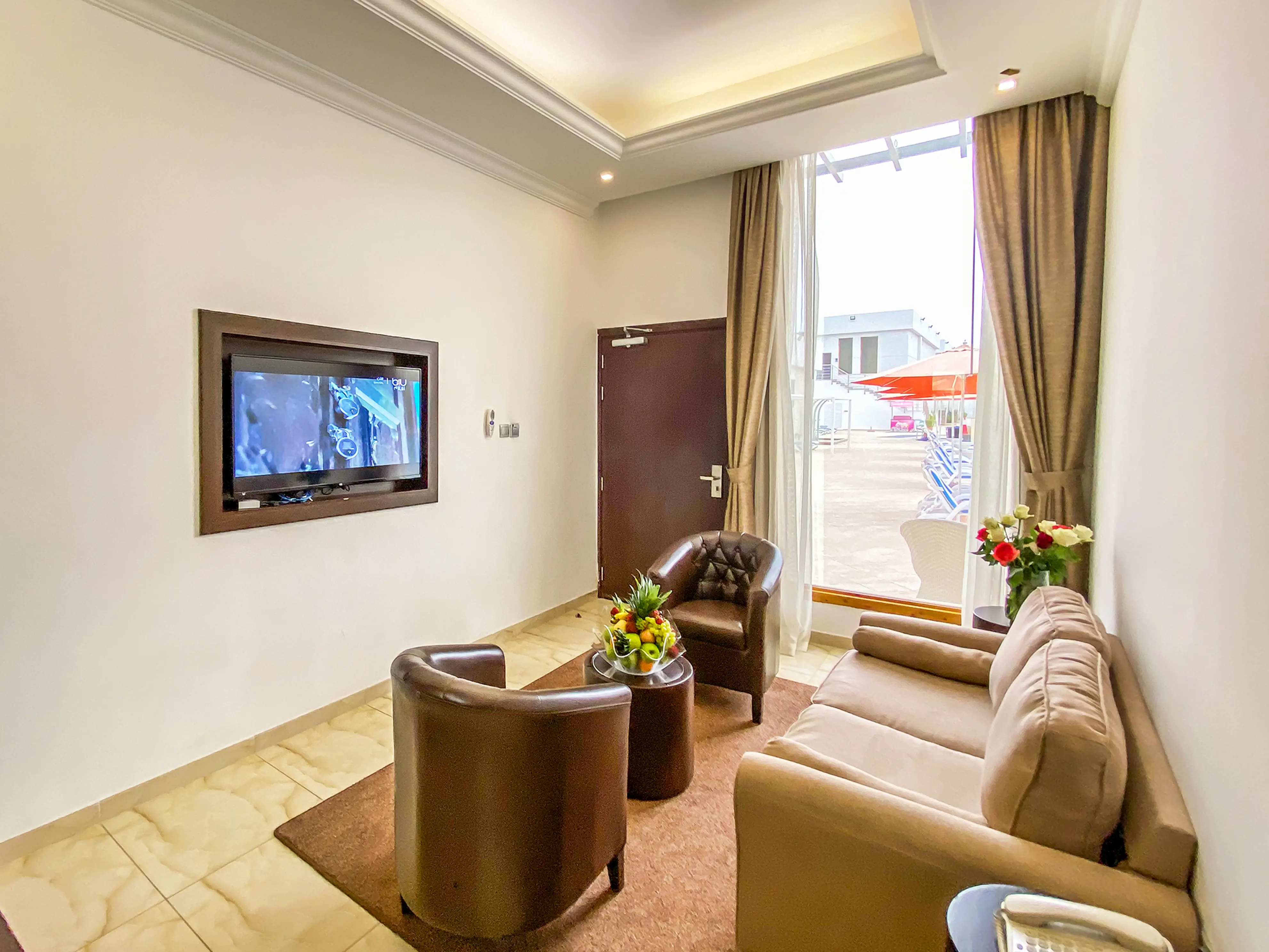 Dla max. 4 osób, Kanały telewizji: Angielski, Telefon w pokoju, wanna lub prysznic , Powierzchnia pokoju: ok. 34 m2, Dostawka: łóżko rozkładane, Rodzaj podłogi: płytki, Sprzątanie codziennie, Salon, 1 sypialnia, Drzwi łączące między pokojami, Maksymalna liczba osób dorosłych: 3, Maksymalna liczba dzieci: 2, Widok niesprecyzowany , Liczba łazienek: 1, Liczba toalet: 1, Zestaw do parzenia kawy i herbaty, Klimatyzacja: Klimatyzacja indywidualna