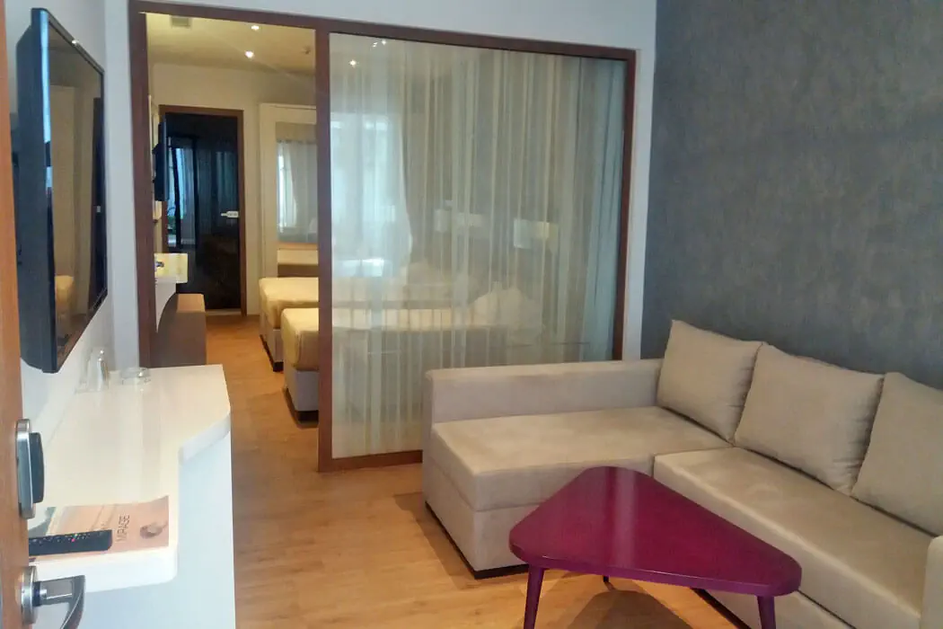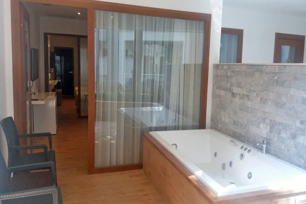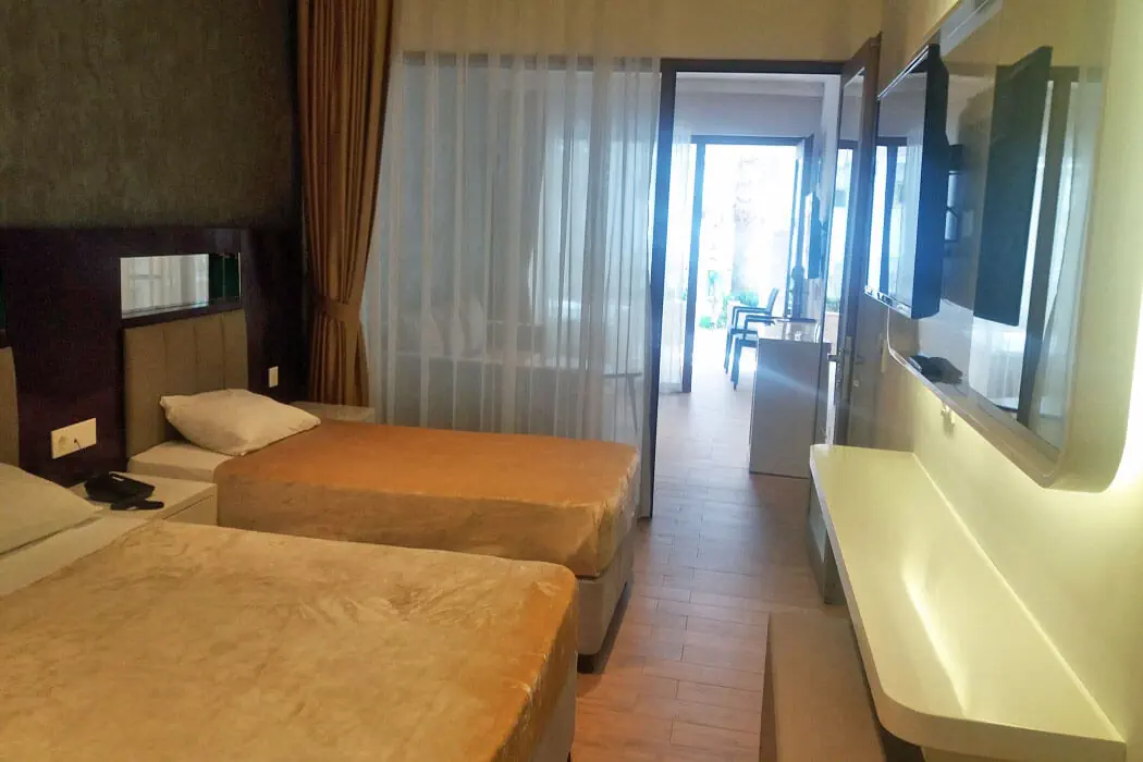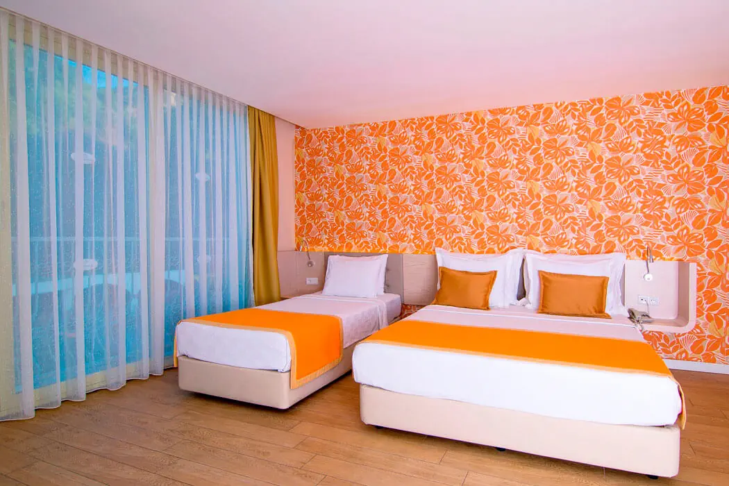 Zlokalizowane są w 5 budynkach: - 3 budynki główne (liczba pięter: 5, liczba wind: 6) - 1 aneks (liczba pięter: 4, liczba wind: 1) - 1 budynek deluxe (liczba pięter: 5, liczba wind: 1) Typy pokoi: - STANDARD ROOM dla max. 3 os.: 1 sypialnia, klimatyzacja indywidualna, sejf (płatny), minibar (pusty), TV, telefon, łazienka (prysznic, WC), balkon - DELUXE ROOM dla max. 4 os.: 1 sypialnia, klimatyzacja indywidualna, sejf (płatny), minibar (pusty), TV, telefon, łazienka (prysznic, WC), balkon - FAMILY ROOM dla max. 5 os.: 1 sypialnia, klimatyzacja indywidualna, sejf (płatny), minibar (pusty), TV, telefon, łazienka (prysznic, WC), balkon - DELUXE WITH JACUZZI dla max. 4 os.: 1 sypialnia, klimatyzacja indywidualna, sejf (płatny), minibar (pusty), TV, telefon, łazienka (prysznic, WC), taras - DUBLEX SUITE dla max. 5 os.: dwupoziomowe, salon, 1 sypialnia, klimatyzacja indywidualna, sejf (płatny), minibar (pusty), TV, łazienka (prysznic, WC), balkon - DELUXE SUIT WITH JACUZZI dla max. 6 os.: salon, 1 sypialnia, drzwi łączące między pokojami, klimatyzacja indywidualna, sejf (płatny), minibar (pusty), TV, telefon, łazienka (prysznic, WC), taras