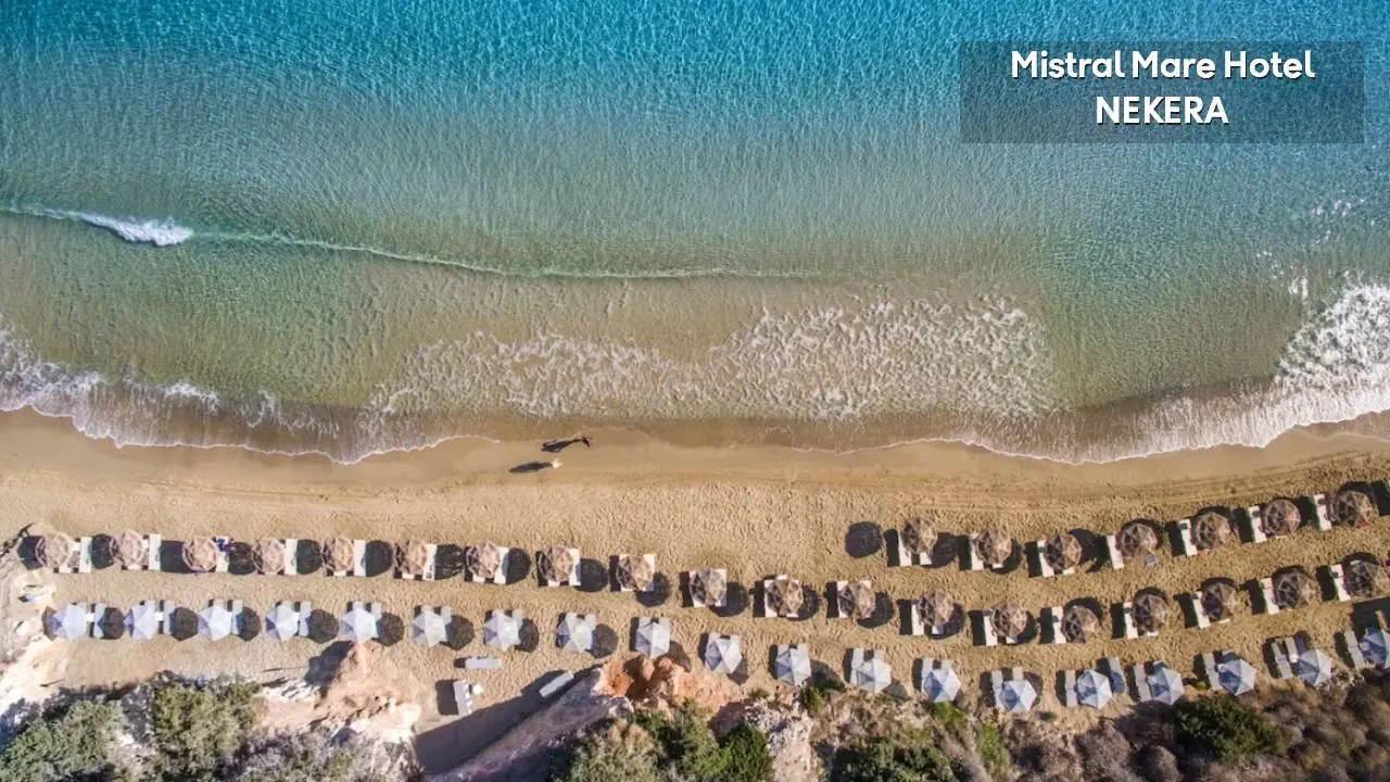 publiczna, piaszczysta plaża oddalona o ok. 200 m od hotelu (zejście po schodach oraz tunelem pod drogą), z łagodnym zejściem do morza. Wyróżniona certyfikatem Błękitna Flaga. Leżaki i parasole słoneczne za opłatą (ok. 12 EUR/2 leżaki i parasol).