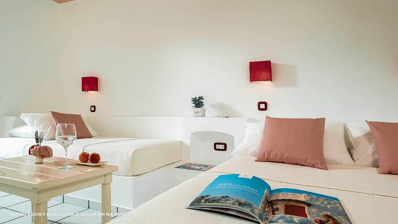 Bungalow• 2-3 os. (ok. 23 m2)• za dopłatą: widok na morze lub bezpośredni widok na morzeRodzinny z widokiem na morze • 2-3 os. (ok. 23 m2)Rodzinny z widokiem na morze 4-os.• 2-4 os. (ok. 23 m2)Apartament rodzinny• 2-5 os. (ok. 32 m2)• widok na morze za dopłatą
