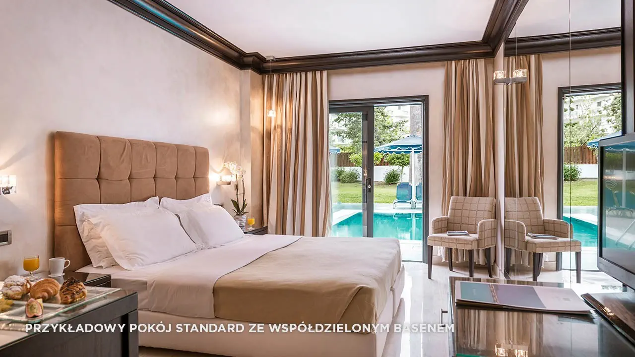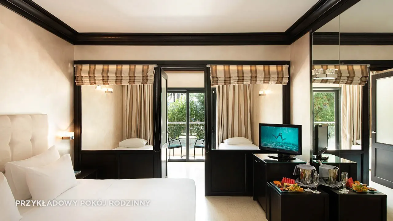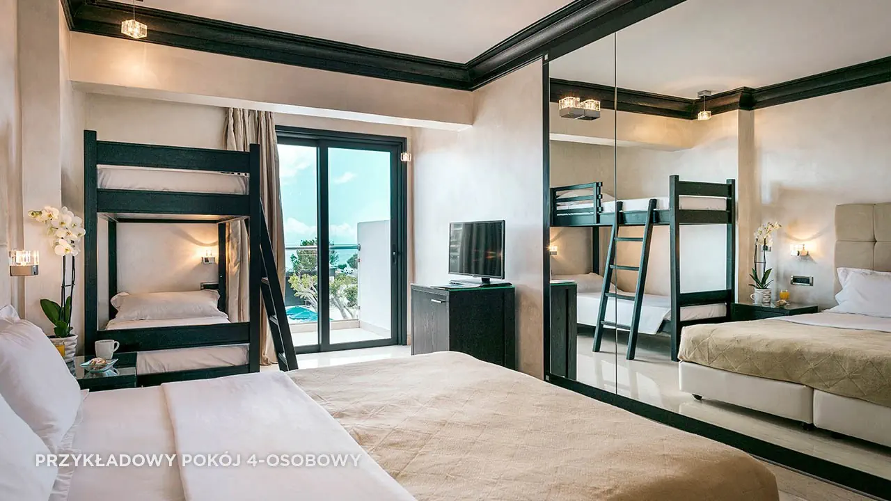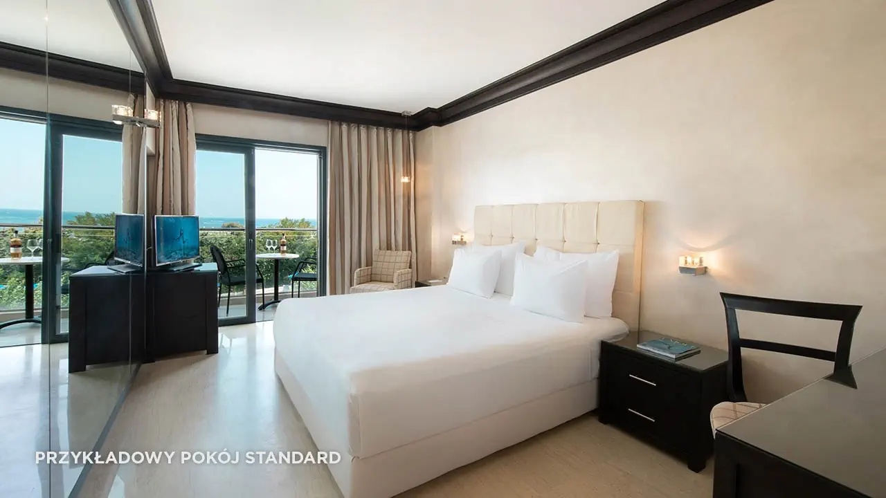 Standard boczny widok na morze• 2-3 os. (ok. 20 m2), dostawka dla 3. os. (wliczając dzieci do 2 lat)• klimatyzacja indywidualna (bezpłatna), zestaw do kawy/herbaty (bezpłatny)• TV-SAT, minibar uzupełniany co drugi dzień (bezpłatny)• automat Nespresso na kapsułki uzupełniany codziennie (bezpłatny)• sejf (bezpłatny), Wi-Fi (bezpłatne/szybkie łącze za dopłatą)• łazienka z wanną, suszarka, mini-kosmetyki, szlafrok i pantofle• boczny widok na morze, balkon lub taras• standard widok na morze za dopłatą• standard z basenem współdzielonym za dopłatą (bez widoku na morze)• standard z prywatnym basenem za dopłatą (bez widoku na morze)• pokój standard 1-os. brak widoku na morzeRodzinny• 2-4 os. (ok. 35 m2)• dostawka dla 3. i 4. os. (wliczając dzieci do 2 lat)• sypialnia i pokój z 2 dodatkowymi łóżkami oddzielony ścianką i drzwiami z szybą• wyposażony jak pokój standard, bez widoku na morzePokój 4 osobowy• 2-4 os. (ok. 25 m2) • dostawka dla 3. osoby dorosłej lub 1. i 2. dziecka, łóżko piętrowe• jedno pomieszczenie, wyposażony jak pokój standard • pokój 4 osobowy widok na morze za dopłatą