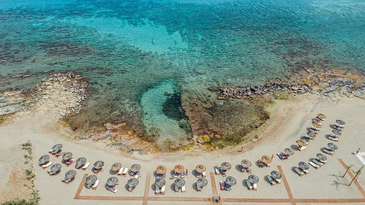 • prywatna i piaszczysta plaża• łagodne, kamieniste wejście do wody• leżaki z materacami i parasole (bezpłatne)• ręczniki plażowe (bezpłatne)