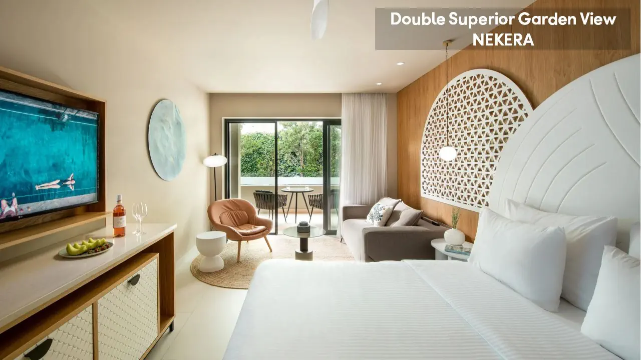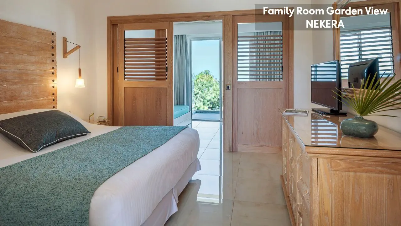 Pokój Dwuosobowy SUPERIOR z widokiem na ogród Superior Double room garden view: ok. 26 m², dla max 2 osób dorosłych i dziecka, łózko podwójne lub 2 łóżka pojedyncze, sofa jako dostawka, klimatyzacja, sejf, TV-Sat., telefon (płatny), mini lodówka (uzupełniana bezpłatnie co drugi dzień), zestaw do parzenia kawy/herbaty, prywatna łazienka ( prysznic/wanna, umywalka, lustro, toaleta, mini kosmetyki, suszarka do włosów), umeblowany balkon/taras. Możliwy widok na morze za dodatkową opłatą. Bungalow z widokiem na ogród Bungalow garden view: ok 30m2 dla max 3 osób dorosłych i dziecka, łózko podwójne i 2 łóżka pojedyncze lub 4 łóżka pojedyncze. Możliwy widok na morze za dodatkową opłatą. Poza tym wyposażone jak pokój dwuosobowy superior. Pokój rodzinny z widokiem na ogród Family garden view: ok 32m2 dla max 4 osób dorosłych, łózko podwójne i 2 łóżka pojedyncze lub 4 łóżka pojedyncze. 2 sypialnie oddzielone drzwiami. Możliwy widok na morze lub z dostępem do współdzielonego basenu za dodatkową opłatą. Poza tym wyposażone jak pokój dwuosobowy superior. Suita rodzinna Family Suite: ok 32m2 dla max 4 osób dorosłych i dziecka, łózko podwójne i 2 łóżka pojedyncze, 2 sofy, 2 sypialnie oddzielone drzwiami. Poza tym wyposażone jak pokój dwuosobowy superior. Pokój dwupoziomowy Duplex ok 32m2 dla max 3 osób dorosłych i dziecka, łózko podwójne i 2 łóżka pojedyncze lub 4 łóżka pojedyncze. Te dwupoziomowe pokoje mieszczą się na parterze i obejmują główną sypialnię na piętrze oraz dodatkową część sypialną na parterze. Poza tym wyposażone jak pokój dwuosobowy superior.