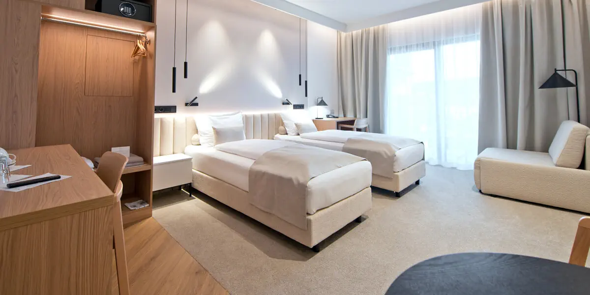 Komfortowy i nowoczesny pokój w podwyższonym standardzie, z widokiem na jezioro i łazienką