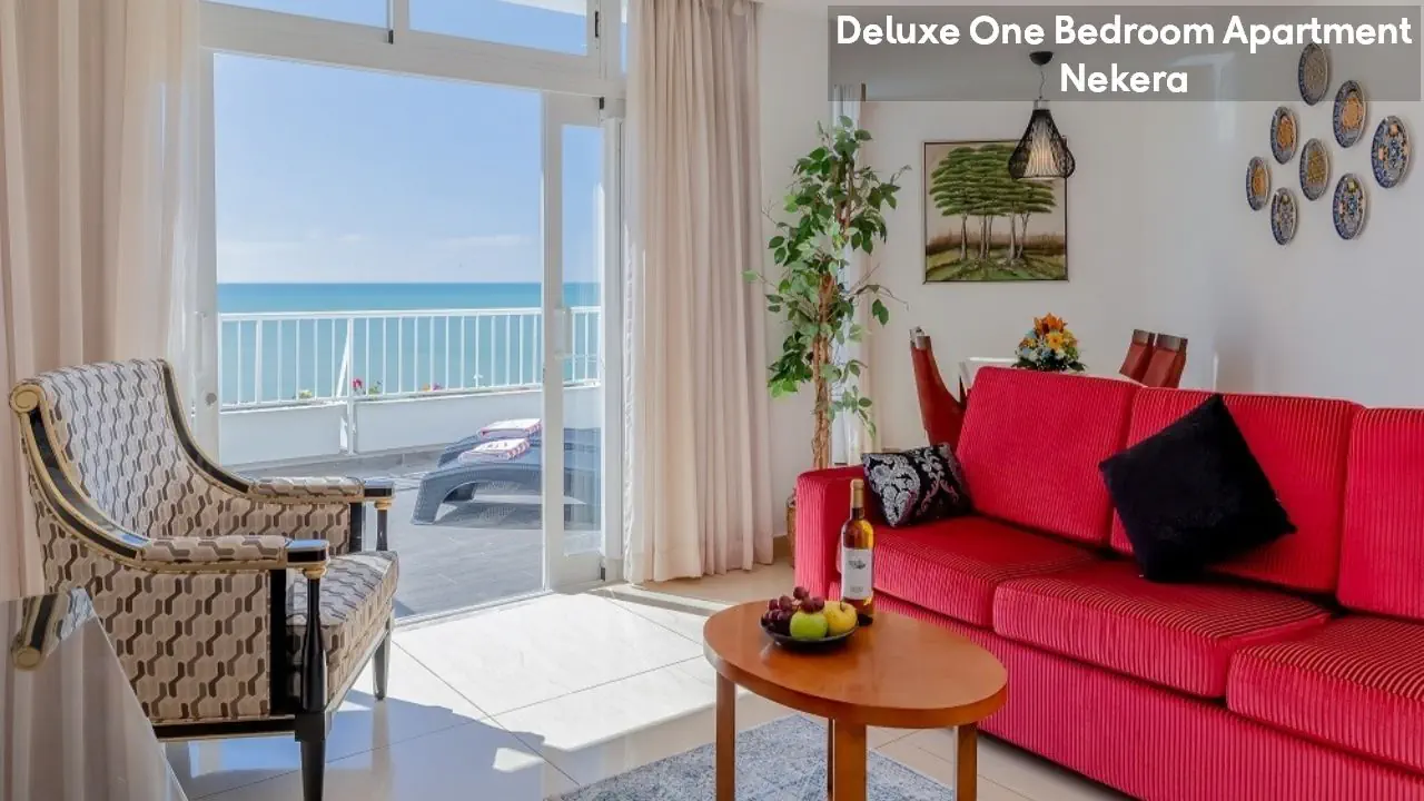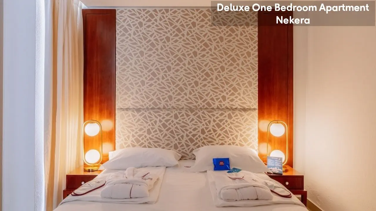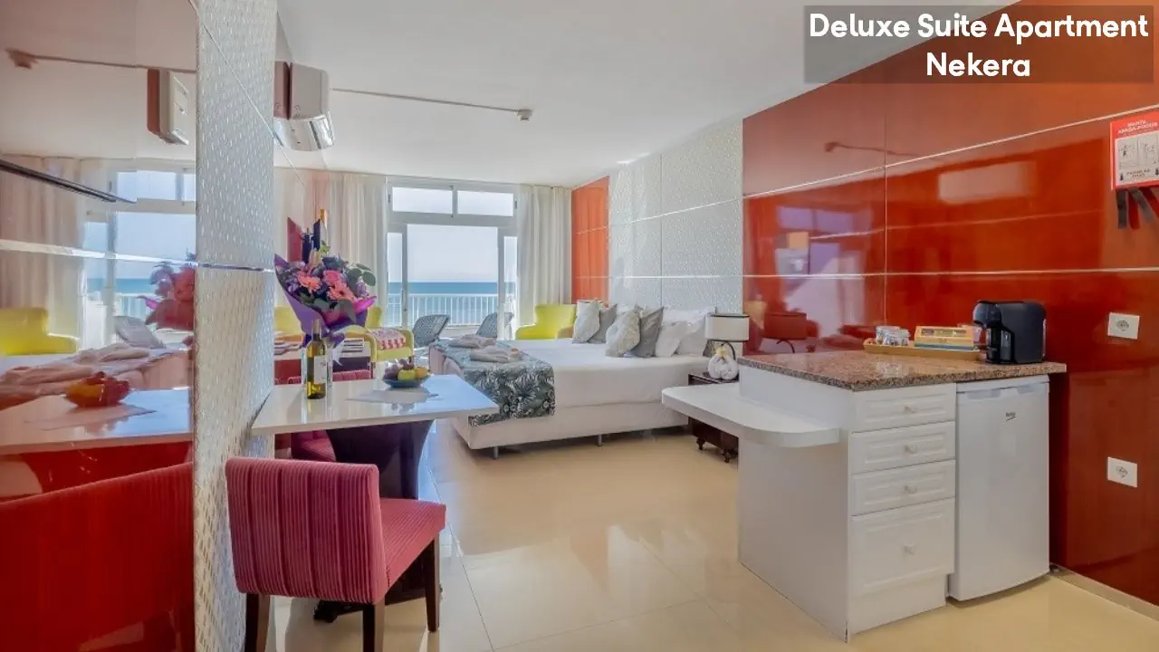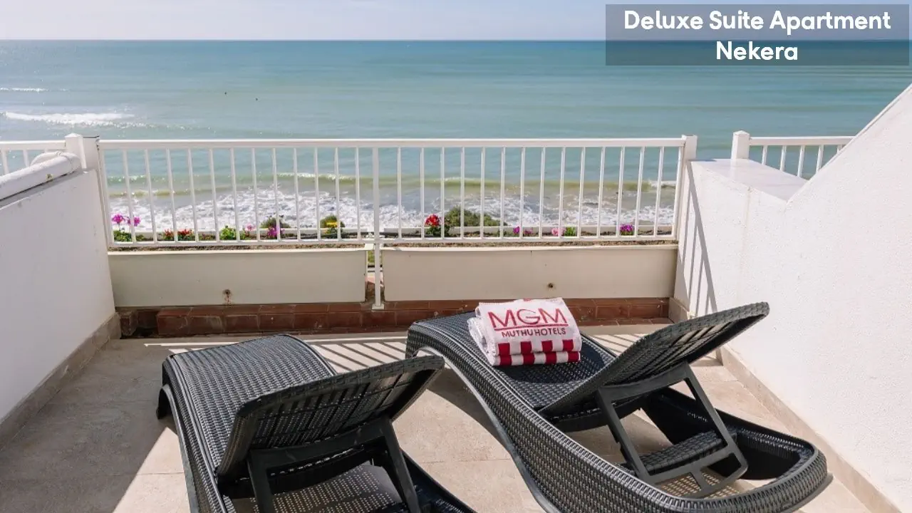 Apartament Deluxe Junior Suite - powierzchnia 21m2 - maksymalnie 2 osoby dorosłe - nowoczesny wystrój - dwa łóżka pojedyncze - taras z krzesłami i stolikiem lub z leżakami - widok na ocean - łazienka z wanną lub prysznicem - suszarka do włosów - aneks kuchenny - lodówka - kuchenka mikrofalowa - zestaw do parzenia kawy i herbaty - telewizja satelitarna - minibar - sejf (za opłatą) Apartament Deluxe Suite z Jedną Sypialnią - powierzchnia 41m2 - maksymalnie 4 osoby dorosłe - nowoczesny wystrój - podwójne łóżko - duży taras z krzesłami, stolikiem i leżakami - widok na ocean - salon z podwójną sofą i fotelem - łazienka z wanną lub prysznicem - suszarka do włosów - aneks kuchenny - stół z krzesłami - lodówka - kuchenka mikrofalowa - zestaw do parzenia kawy i herbaty - telewizja satelitarna - menu poduszek (za opłatą) - minibar - sejf (za opłatą) Apartament Deluxe Suite z Dwiema Sypialniami - powierzchnia 50m2 - maksymalnie 6 osób dorosłych - główna sypialnia z łóżkiem podwójnym oraz prywatnym balkonem i łazienką - dodatkowa sypialnia z przestronną szafą - duży taras z krzesłami, stolikiem i leżakami - widok na ocean - salon z podwójną sofą - łazienka z wanną lub prysznicem - suszarka do włosów - aneks kuchenny - stół z krzesłami - lodówka - kuchenka mikrofalowa - zestaw do parzenia kawy i herbaty - telewizja satelitarna - menu poduszek (za opłatą) - minibar - sejf (za opłatą)