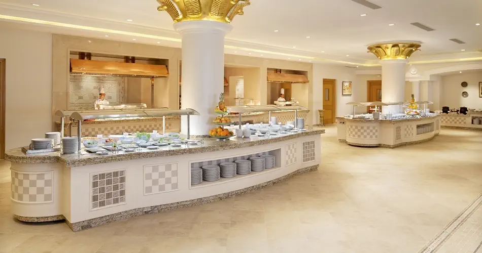 All Inclusive 24h: - Śniadanie, obiad i kolacja w formie bufetu - Bardzo wczesne śniadania i późne, lekkie śniadania - Przekąski w ciągu dnia, w określonych godzinach - Przekąski wieczorne do godziny 03:30 - Jedna kolacja na pobyt w restauracji a'la carte (Hiszpańska i Japonska), wymagana wcześniejsza rezerwacja - Napoje bezalkoholowe i alkohole lokalnej produkcji dostępne są przez całą dobę - Alkohole importowane są dodatkowo płatne - Wymagane długie spodnie dla meżczyzn i formalny strój dla kobiet pod czas kolacji.