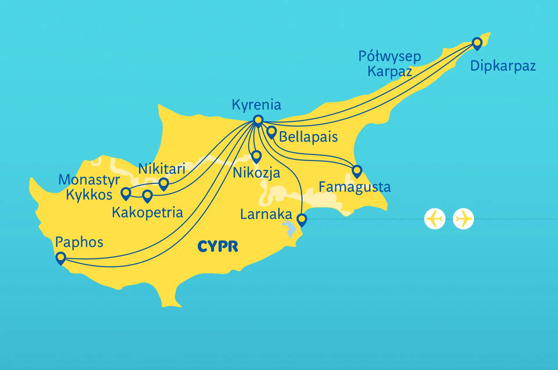Do dyspozycji gości Recepcja, restauracja i bar, basen zewnętrzny. Wyżywienie śniadania kontynentalne typu bufet; możliwość dopłaty do pakietu 7 obiadokolacji (w dniu 1 suchy prowiant). Zakwaterowanie Pia Bella **** (lub podobny) - Kameralny hotel, prowadzony przez lokalną rodzinę, położony w malowniczym, dobrze utrzymanym ogrodzie. W bliskim sąsiedztwie znajdują się liczne restauracje i bary, a nieopodal mieści się historyczny port w Kyrenii. Pokoje 2-osobowe (możliwość dostawki), wszystkie z łazienkami, klimatyzacją.