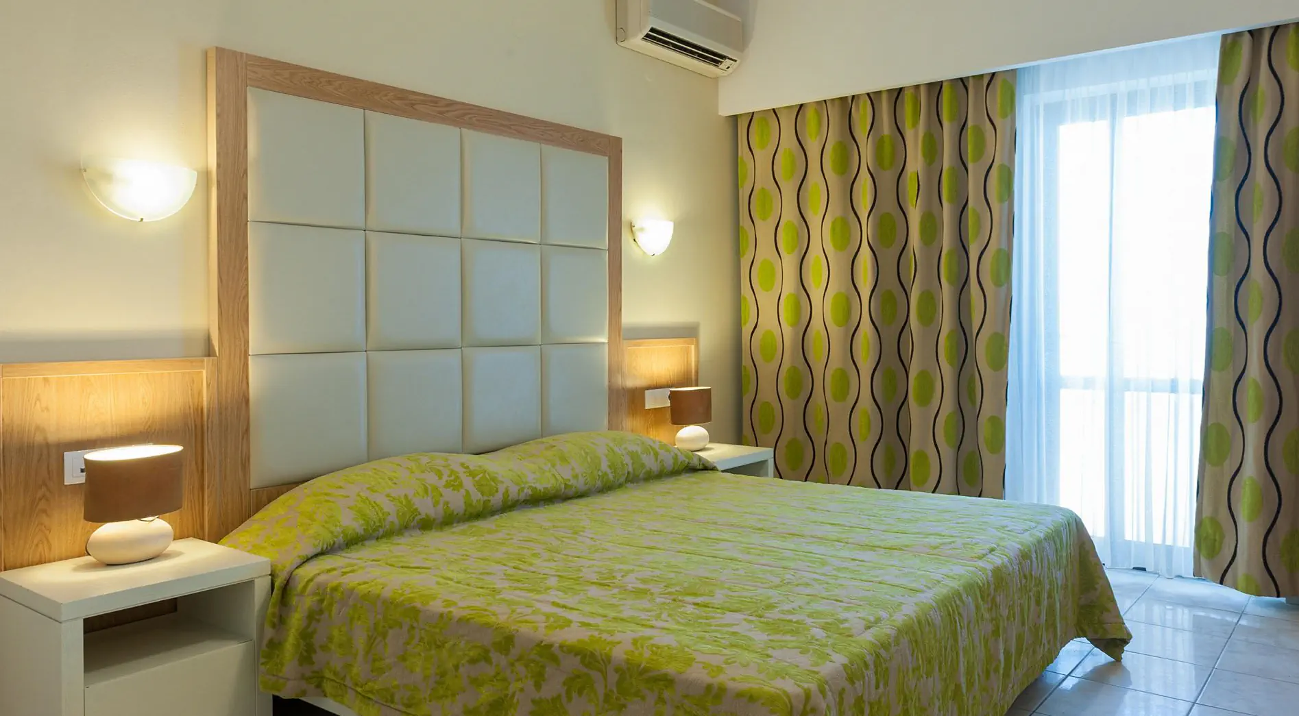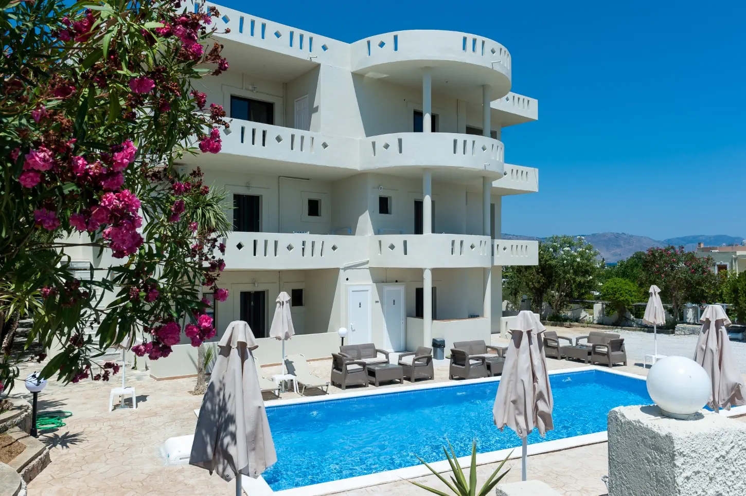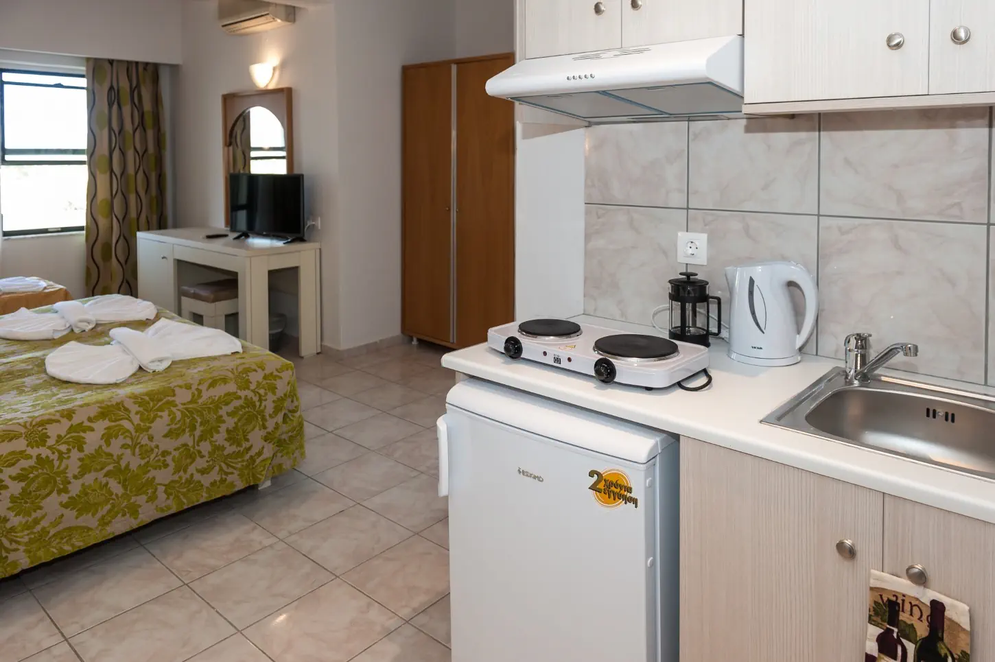 studia dwuosobowe od strony ogrodu (DBL STUDIO GV): ok. 25 m2, studia trzyosobowe od strony ogrodu (TRPL STUDIO GV): ok. 28 m2; wyposażone w: klimatyzację, TV-Sat., telefon, sejf, minilodówkę, wnękę kuchenną, czajnik elektryczny, balkon lub taras. Prysznic, WC, suszarka. Studia dwuosobowe z widokiem na morze (DBL STUDIO SV). Studia trzyosobowe z widokiem na morze (TRPL STUDIO SV). Na zapytanie.