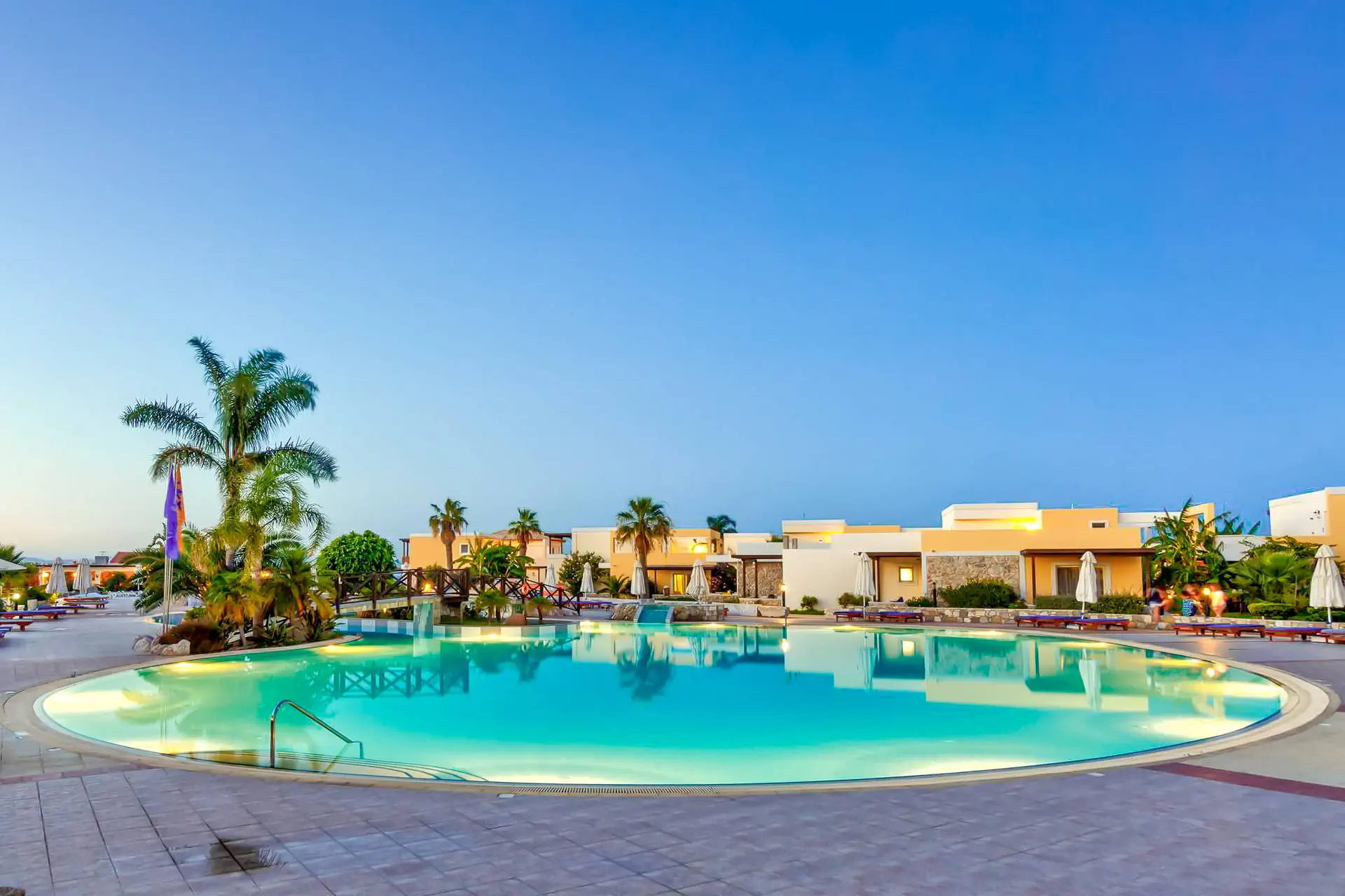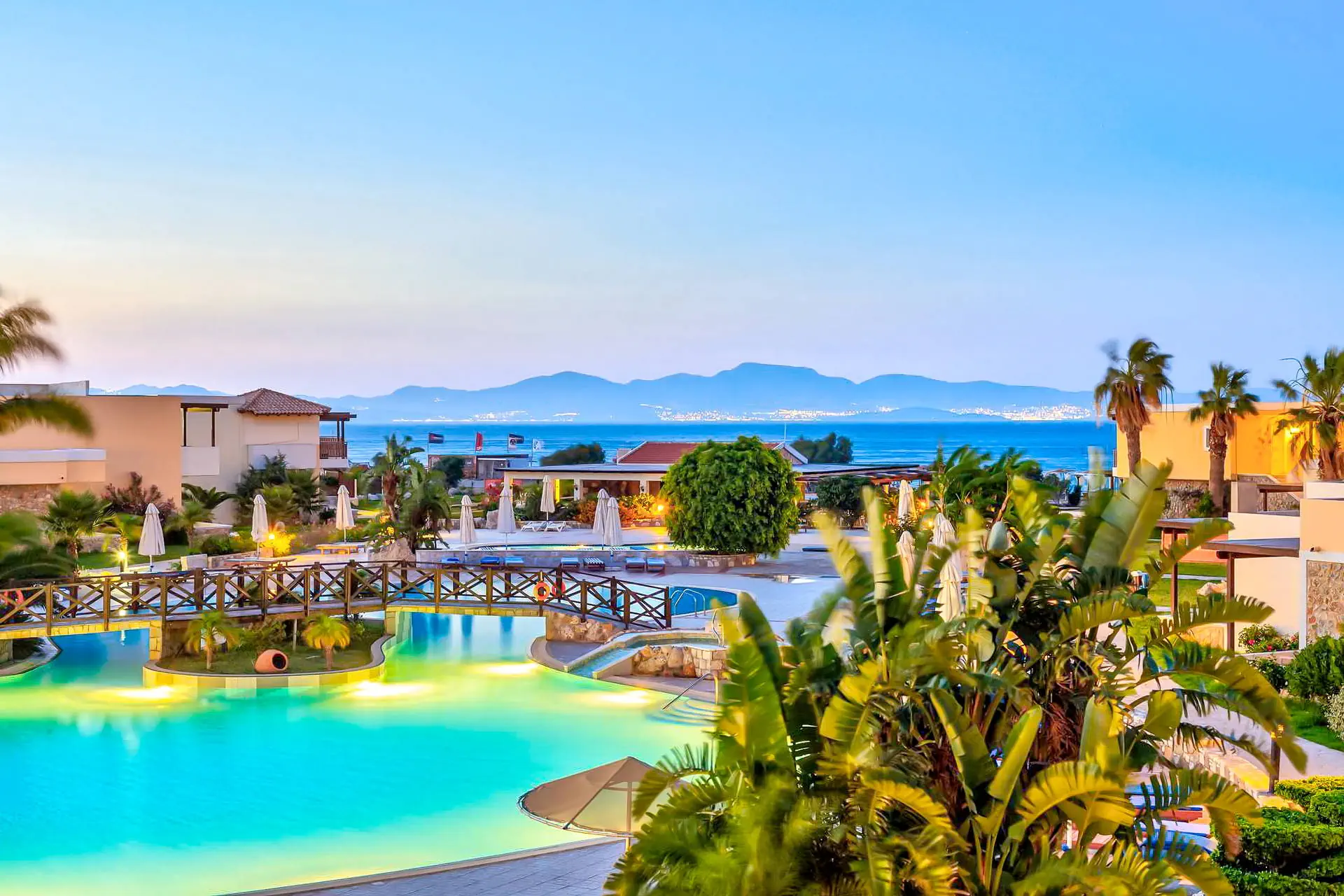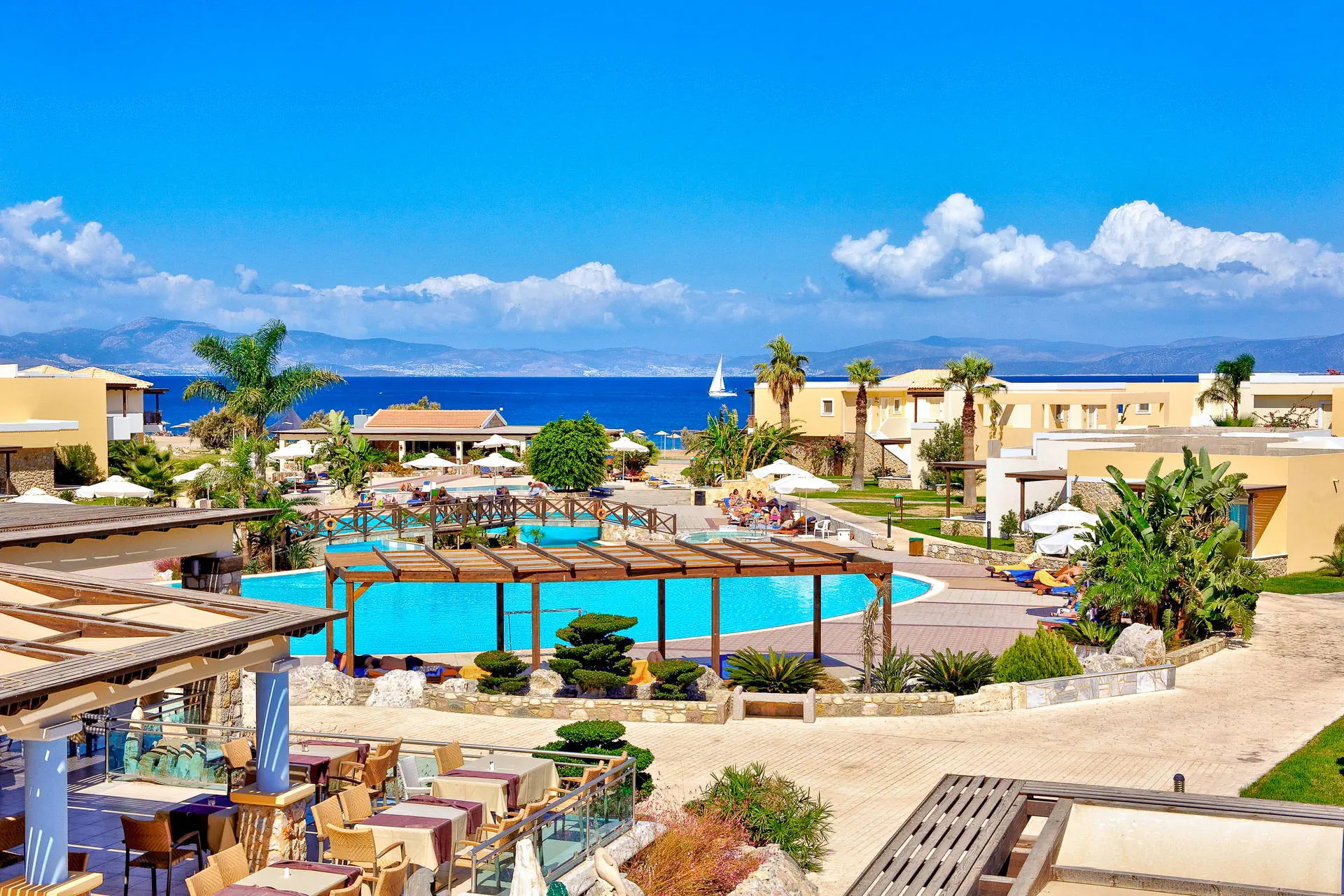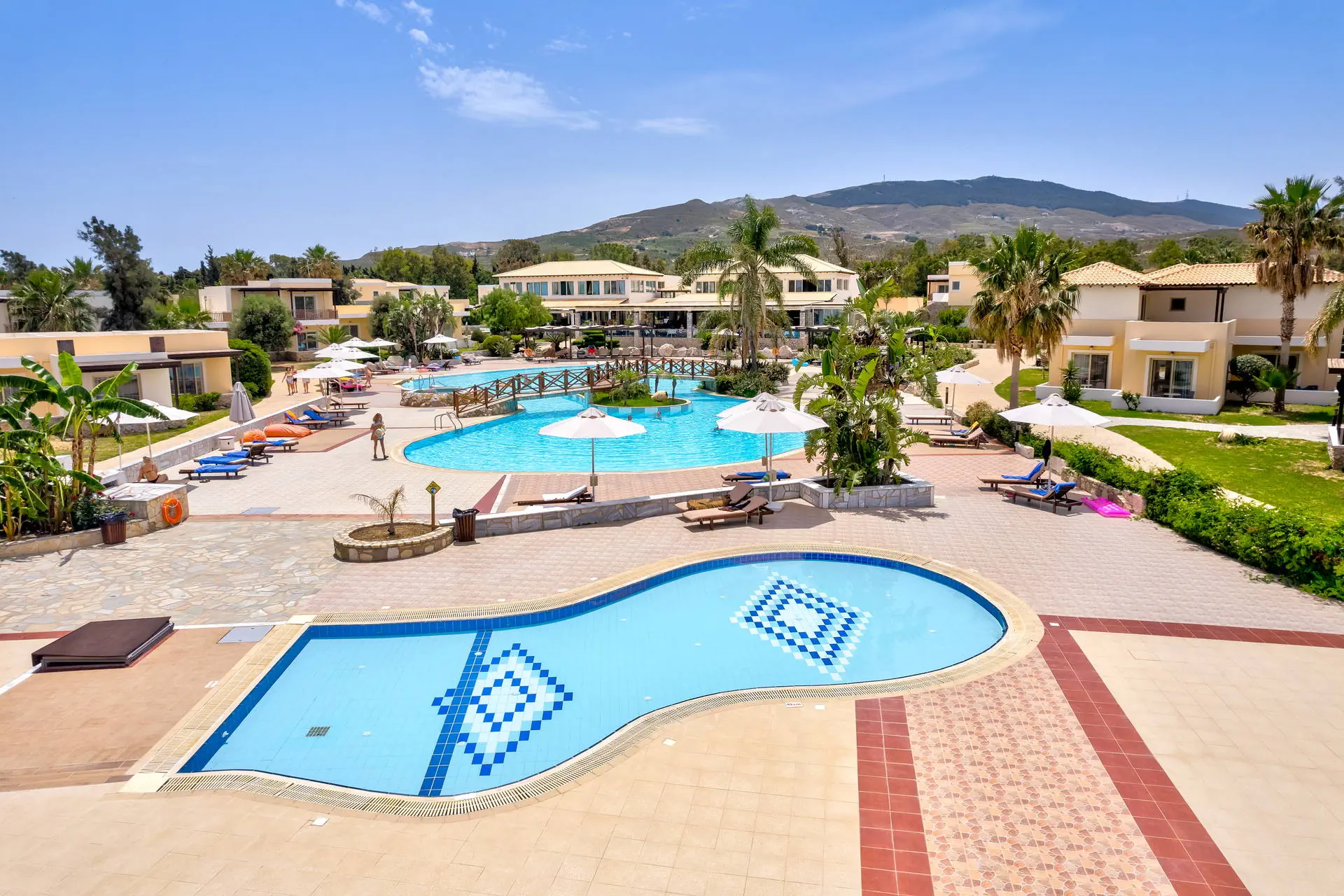 Do dyspozycji gości Recepcja z lobby dostępne dla Gości hotelu. 3 baseny ze słodką wodą, w tym 1 wewnętrzny (płatny), 2 brodziki dla dzieci, jacuzzi, leżaki i parasole przy basenach bezpłatnie, ręczniki kąpielowe dostępne za depozytem. Restauracje: klimatyzowana restauracja główna „Ambrosia” z zadaszonym tarasem zewnętrznym, bar główny. Pozostałe informacje: Internet Wi-Fi bezpłatny w częściach ogólnodostępnych, wypożyczalnia rowerów i samochodów (płatne), mini market (płatne). Kategoria lokalna ***** Naszym zdaniem Hotel oferuje pakiet all inclusive, który zapewnia pełen komfort podczas pobytu. To doskonałe miejsce dla osób ceniących spokój i relaks. Goście mogą w pełni oddać się odpoczynkowi, nie martwiąc się o dodatkowe koszty. Oferta jest idealna dla tych, którzy chcą spędzić wakacje w spokojnej atmosferze, z dala od zgiełku i codziennych trosk. Pokoje 175 elegancko urządzonych i przestronnych pokoi dla maksymalnie 5 osób (w zależności od typu pokoju). Na balkonie/tarasie meble ogrodowe (2 krzesła i stolik). Pokoje znajdują się w kilku budynkach typu bungalow. W pokojach łazienka (WC, wanna lub prysznic, suszarka do włosów), TV-Sat, telefon, klimatyzacja indywidualnie sterowana, sejf (bezpłatnie), lodówka. Hotel zapewnia wyłącznie łóżka typu Twin. Położenie Hotel położony jest w Psalidi, tuż przy plaży. Odległość od lotniska wynosi około 28 km. Obiekt znajduje się około 5 km od miasta Kos. Do miasta Kos można dostać się taksówką lub komunikacją miejską, a w pobliżu hotelu znajduje się przystanek autobusowy. UWAGA! Cena nie obejmuje lokalnego podatku turystycznego w wysokości ok. 15 EUR/pokój/dzień. Podatek jest obligatoryjny i płatny bezpośrednio w recepcji, przed zakwaterowaniem Klientów w hotelu. Program sportowy i animacyjny Dla każdego: siłownia, kort tenisowy i możliwość wypożyczenia sprzętu, tenis stołowy. Za dodatkową opłatą: bilard, centrum SPA z krytym basenem i sauną oferuje wiele zabiegów i masaży. Wyżywienie Rodzaje wyżywienia i posiłki: All Inclusive: Śniadania: obfity bufet 07:00 - 10:00. Obiady: 12:30 - 14:00, podczas obiadów piwo, wino, napoje bezalkoholowe i lody. Kolacje: obfity bufet 19:30 - 21:30, podczas kolacji piwo, wino, napoje bezalkoholowe i lody. Bary: Napoje bezalkoholowe i lokalne alkohole w godzinach 12:00 - 23:00 w wyznaczonych barach. Pozostałe informacje: Możliwość korzystania z all inclusive kończy się wraz z ostatnią dobą hotelową. Plaża Plaża bezpośrednio przy hotelu. Publiczna, kamienisto-piaszczysta. Leżaki i parasole bezpłatne. Internet Internet Wi-Fi w częściach ogólnodostępnych w cenie. Strona www
