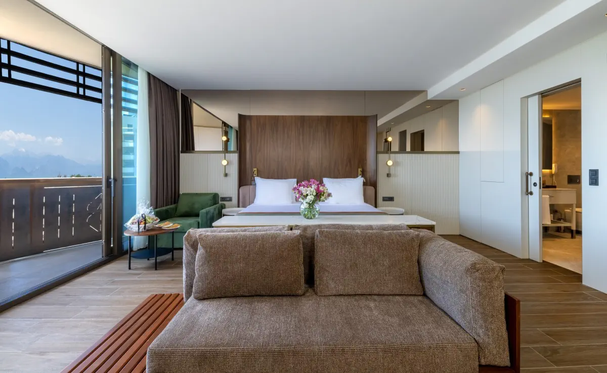 Dla max. 3 osób, Przestrzeń zewnętrzna: Balkon, Kanały telewizji: Angielski, Telefon w pokoju, prysznic, Powierzchnia pokoju: ok. 32 m2, Dostawka: łóżko rozkładane, Rodzaj podłogi: laminat, Sprzątanie codziennie, 1 sypialnia, Maksymalna liczba osób dorosłych: 3, Maksymalna liczba dzieci: 2, Widok na ogród,Boczny widok na morze,Frontalny widok na morze,Od strony morza,Częściowy widok na morze, Liczba łazienek: 1, Liczba toalet: 1, Zestaw do parzenia kawy i herbaty, Klimatyzacja: Klimatyzacja centralna, Działa w godzinach: 24h