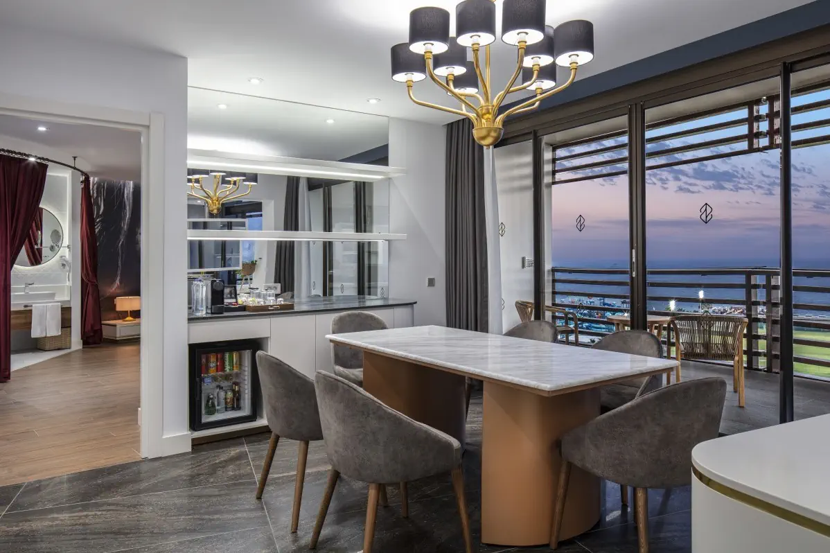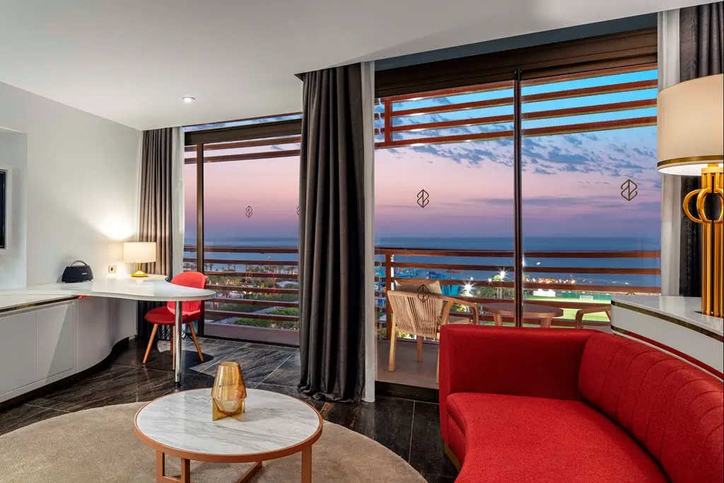 Dla max. 4 osób, Przestrzeń zewnętrzna: Balkon, Kanały telewizji: Angielski, Telefon w pokoju, , Powierzchnia pokoju: ok. 116 m2, Rodzaj podłogi: płytki, Sprzątanie codziennie, Salon, część jadalniana, 2 sypialnie, Drzwi łączące między pokojami, Maksymalna liczba osób dorosłych: 4, Maksymalna liczba dzieci: 2, Widok na morze, Liczba łazienek: 2, Liczba toalet: 3, Zestaw do parzenia kawy i herbaty, Klimatyzacja: Klimatyzacja centralna, Działa w godzinach: 24h