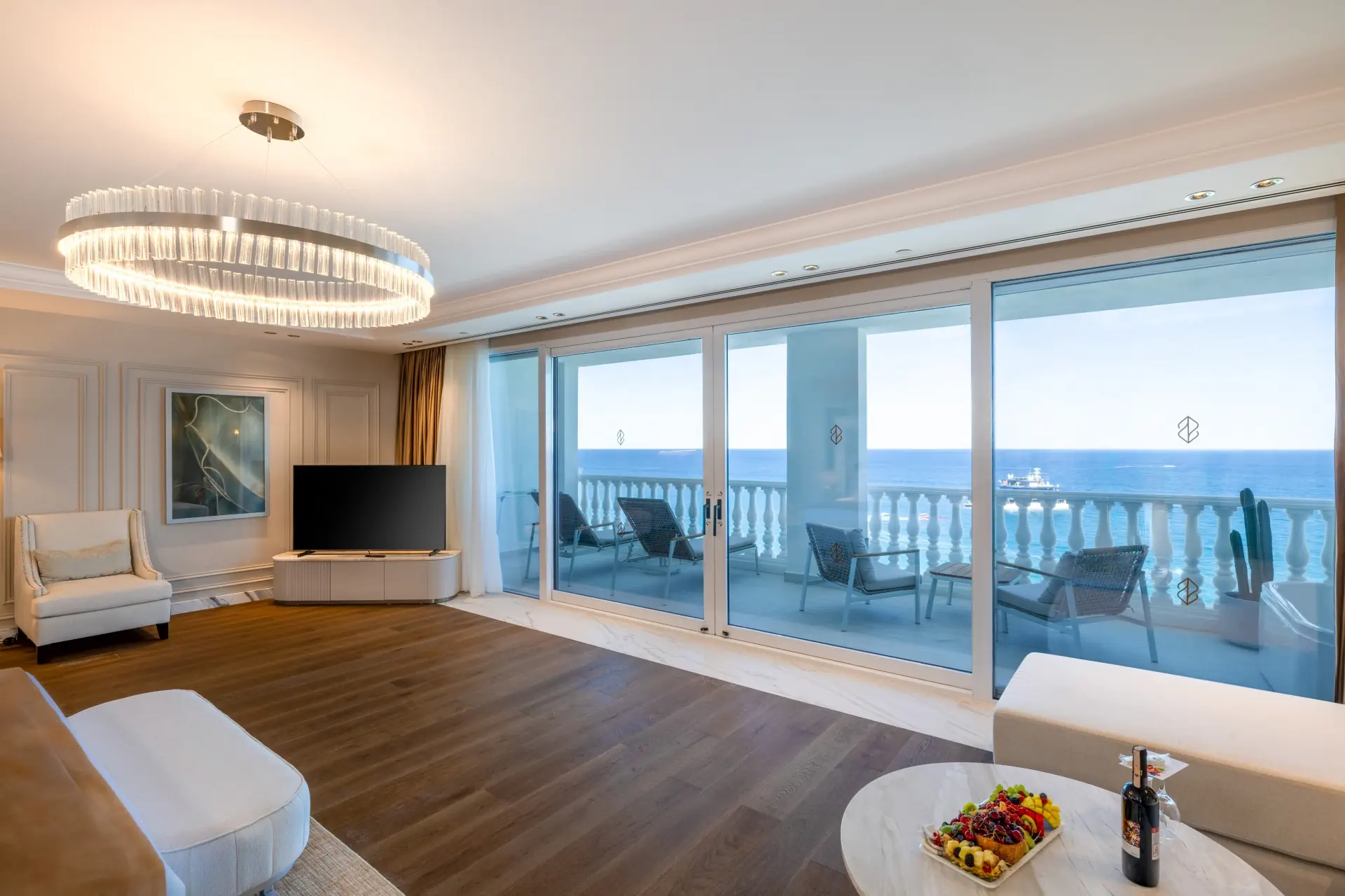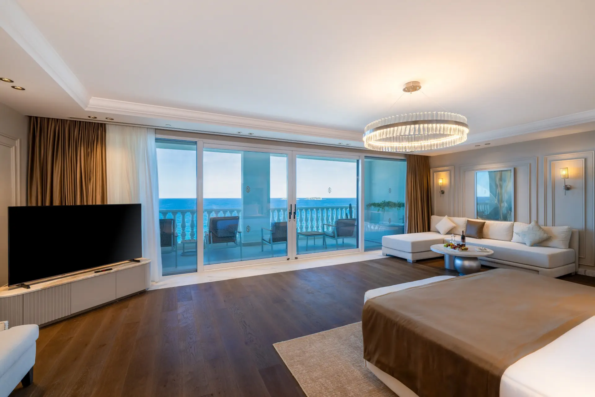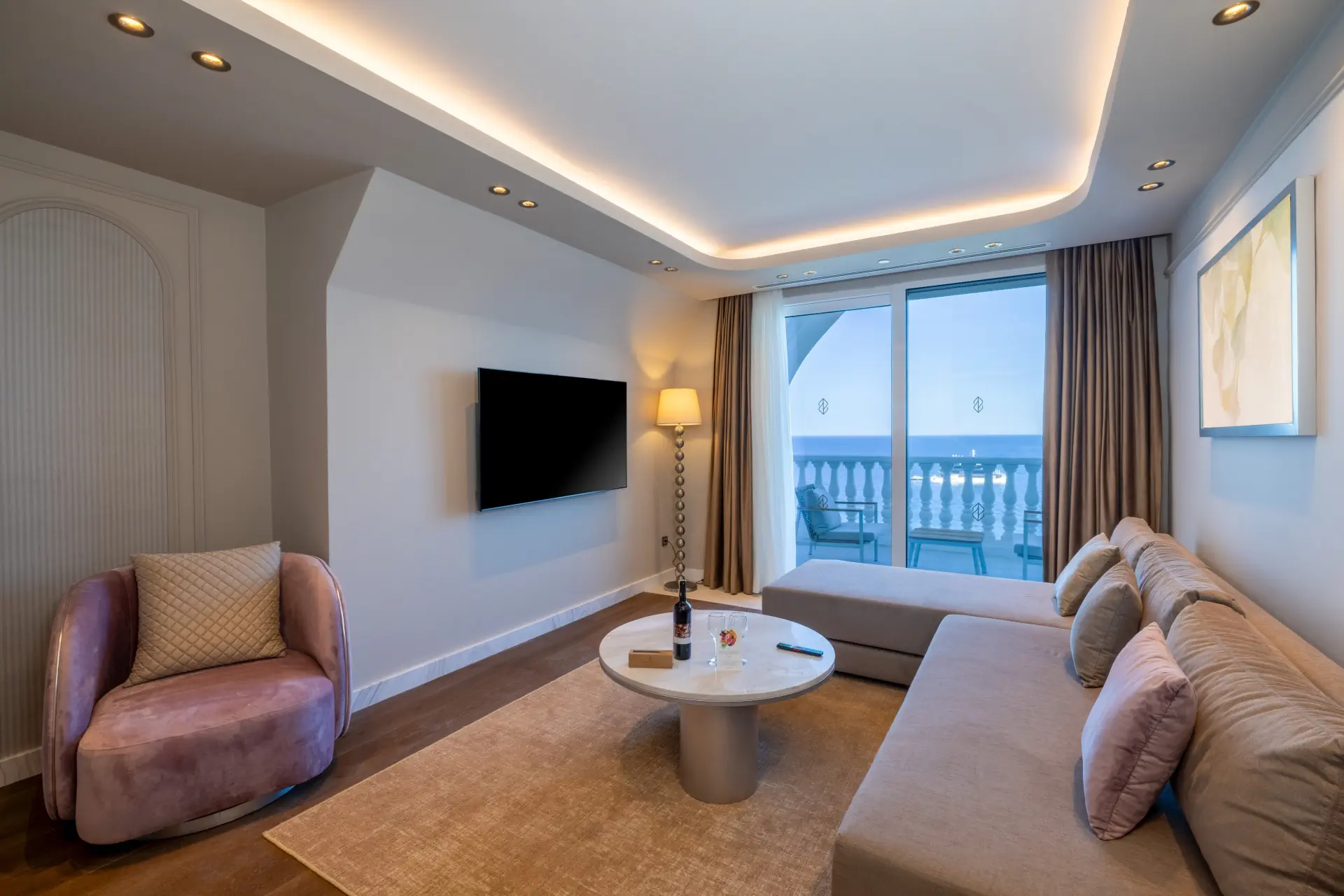 Dla max. 4 osób, Przestrzeń zewnętrzna: Balkon, Kanały telewizji: Angielski, Telefon w pokoju, wanna i prysznic , Powierzchnia pokoju: ok. 78 m2, Dostawka: sofa, Rodzaj podłogi: wykładzina, Sprzątanie codziennie, Salon, 1 sypialnia, Drzwi łączące między pokojami, Maksymalna liczba osób dorosłych: 3, Maksymalna liczba dzieci: 2, Widok na morze, Liczba łazienek: 1, Liczba toalet: 1, Klimatyzacja: Klimatyzacja centralna