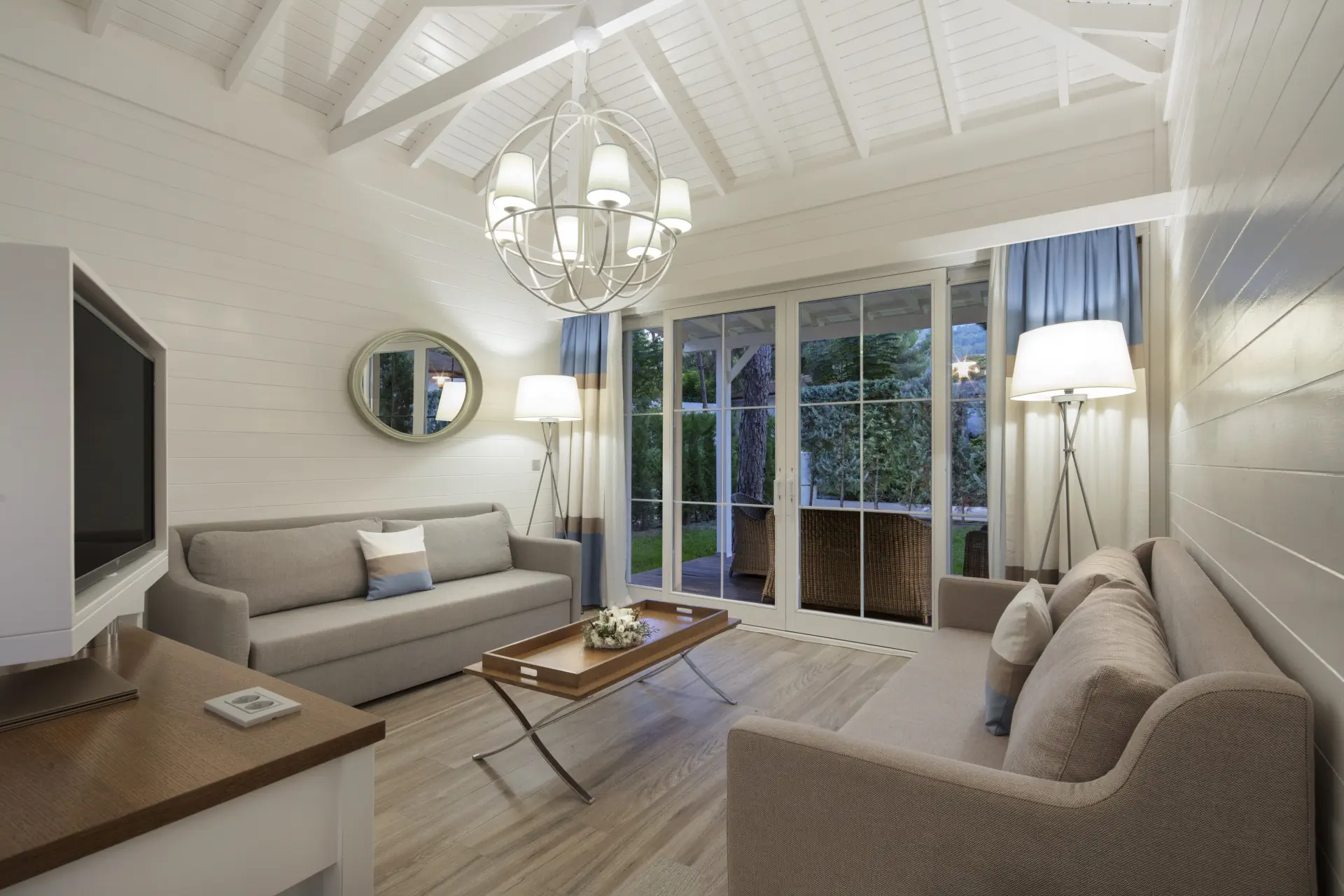 Dla max. 5 osób, Przestrzeń zewnętrzna: Balkon, Kanały telewizji: Angielski, Telefon w pokoju, prysznic, Powierzchnia pokoju: ok. 51 m2, Dostawka: sofa, Rodzaj podłogi: laminat, Sprzątanie codziennie, Salon, część jadalniana, 1 sypialnia, Drzwi łączące między pokojami, Maksymalna liczba osób dorosłych: 4, Maksymalna liczba dzieci: 2, Widok na ogród, Liczba łazienek: 1, Liczba toalet: 1, Zestaw do parzenia kawy i herbaty, Klimatyzacja: Klimatyzacja centralna, Działa w godzinach: 24h, przez cały rok
