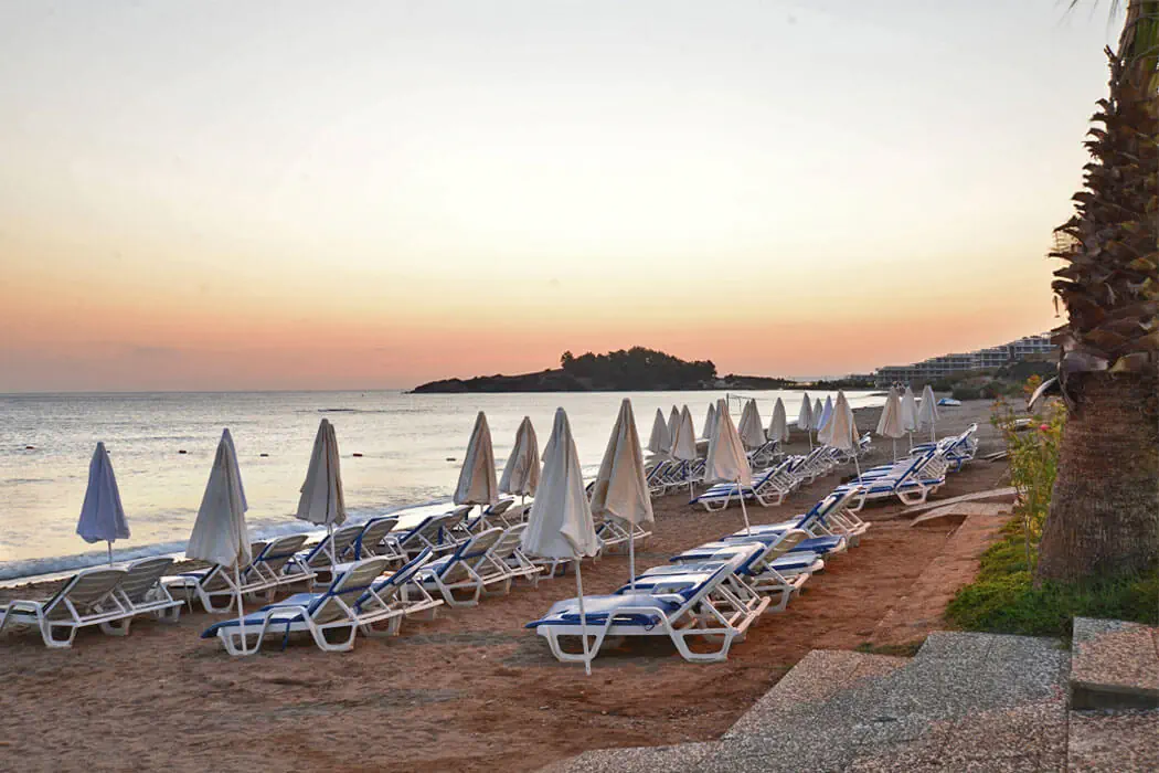 Przy hotelu, prywatna, piaszczysto-żwirowa, odznaczona certyfikatem Błękitnej Flagi. Bezpłatne: parasole, leżaki, ręczniki plażowe, bar na plaży.