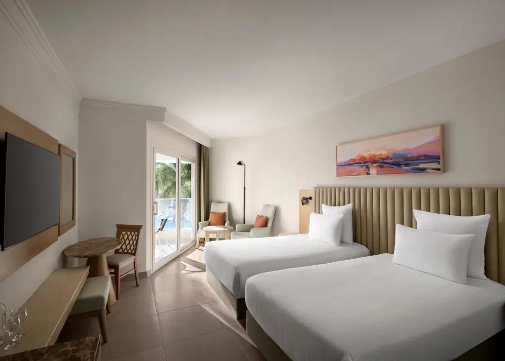 Dla max. 4 osób, Przestrzeń zewnętrzna: Balkon lub taras, Kanały telewizji: Angielski, Telefon w pokoju, prysznic, Powierzchnia pokoju: ok. 40 m2, Dostawka: łóżko rozkładane, Rodzaj podłogi: płytki, Sprzątanie codziennie, 1 sypialnia, Maksymalna liczba osób dorosłych: 2, Maksymalna liczba dzieci: 2, Widok niesprecyzowany ,Widok na ogród,Od strony basenu, Liczba łazienek: 1, Liczba toalet: 1, Zestaw do parzenia kawy i herbaty, Klimatyzacja: Klimatyzacja centralna, Działa w godzinach: 00:00-23:59Kwiecień, Maj, Czerwiec, Lipiec, Sierpień, Wrzesień, Październik, Listopad, Grudzień