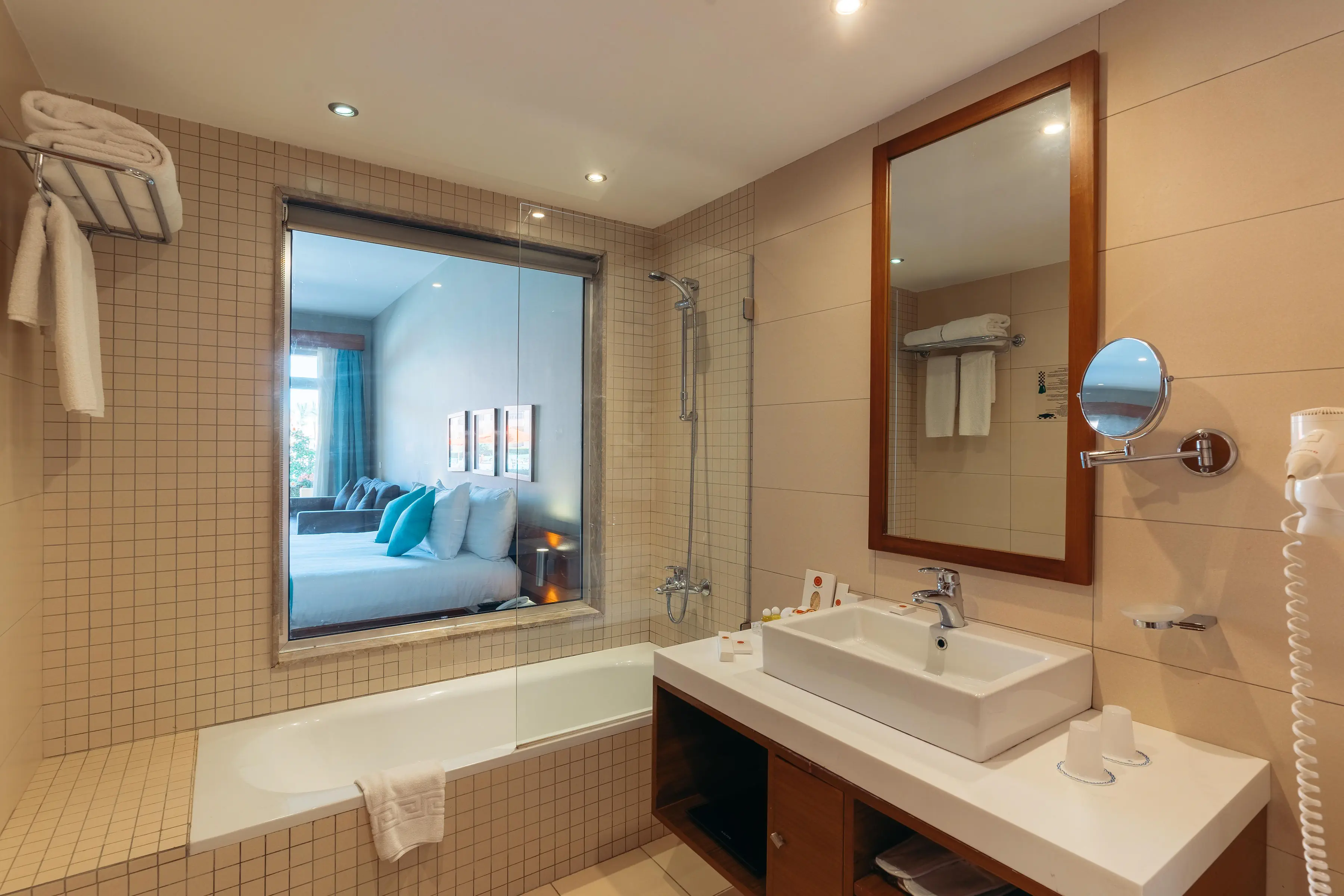 Dla max. 4 osób, Przestrzeń zewnętrzna: Balkon lub taras, Kanały telewizji: Polski, Angielski, Telefon w pokoju, wanna, Powierzchnia pokoju: ok. 45 - 50 m2, Dostawka: łóżko standardowe, Rodzaj podłogi: płytki, Sprzątanie codziennie, 1 sypialnia, Maksymalna liczba osób dorosłych: 3, Maksymalna liczba dzieci: 2, Widok na basen,Częściowy widok na morze, Liczba łazienek: 1, Liczba toalet: 1, Zestaw do parzenia kawy i herbaty, Klimatyzacja: Klimatyzacja indywidualna