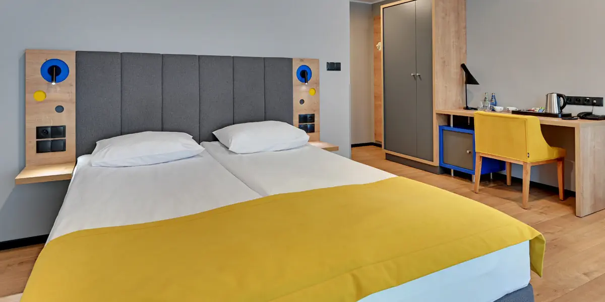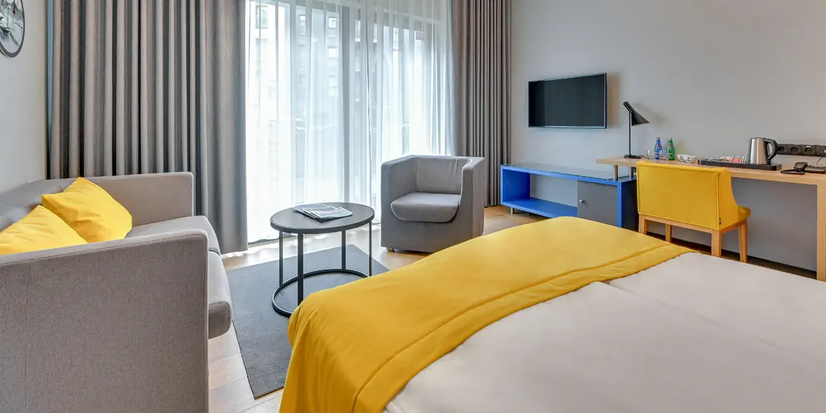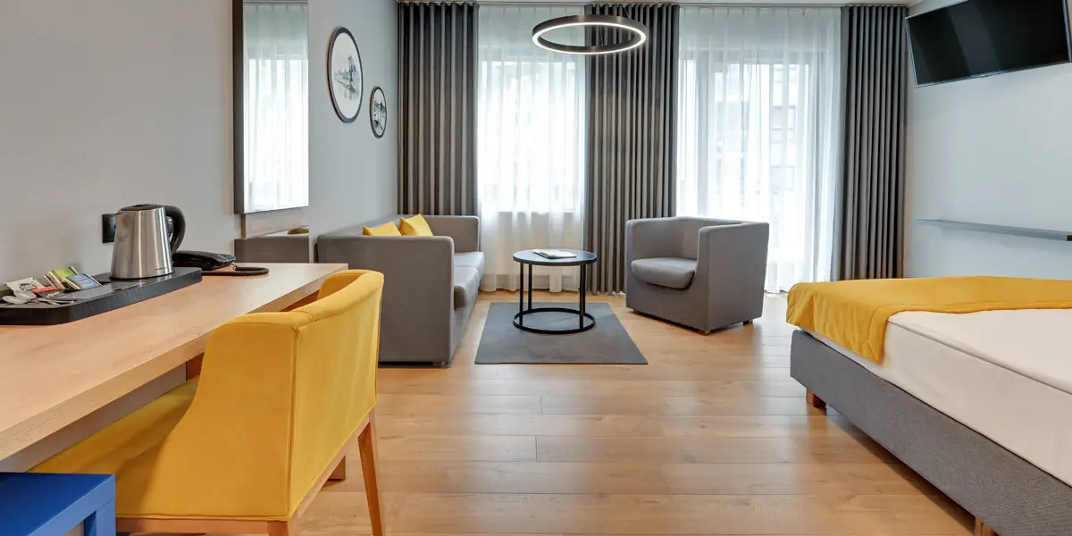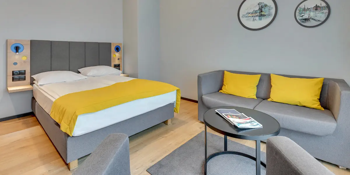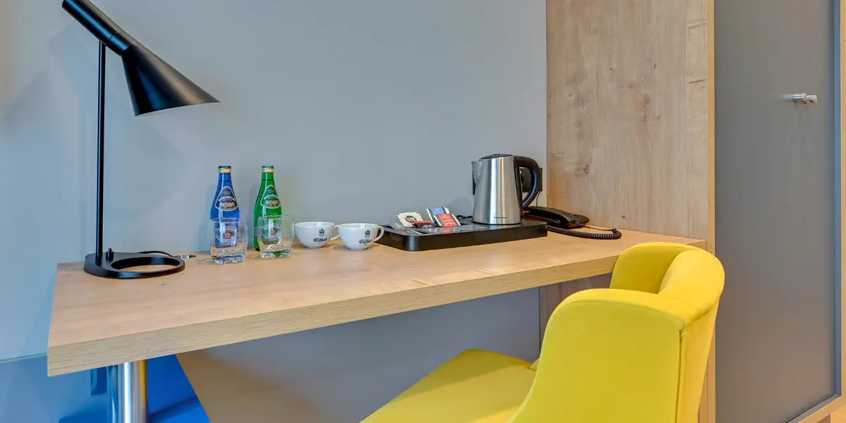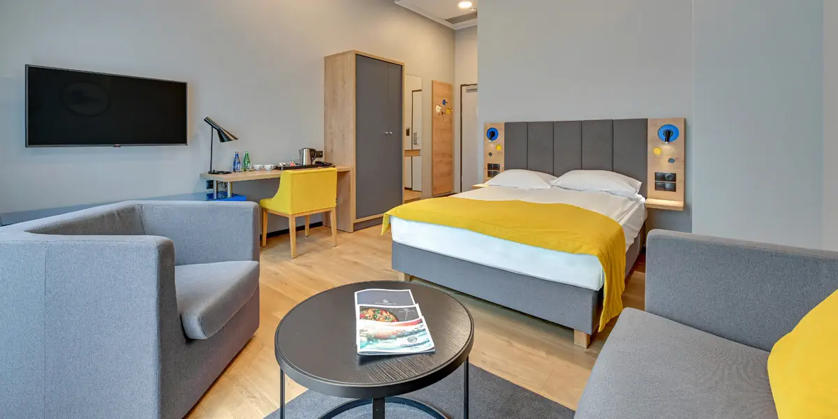 Komfortowy utrzymany we współczesnym designie pokój wyposażony w: klimatyzację, TV, Wi-Fi, zestaw do kawy i herbaty. W łazience prysznic i suszarka do włosów.