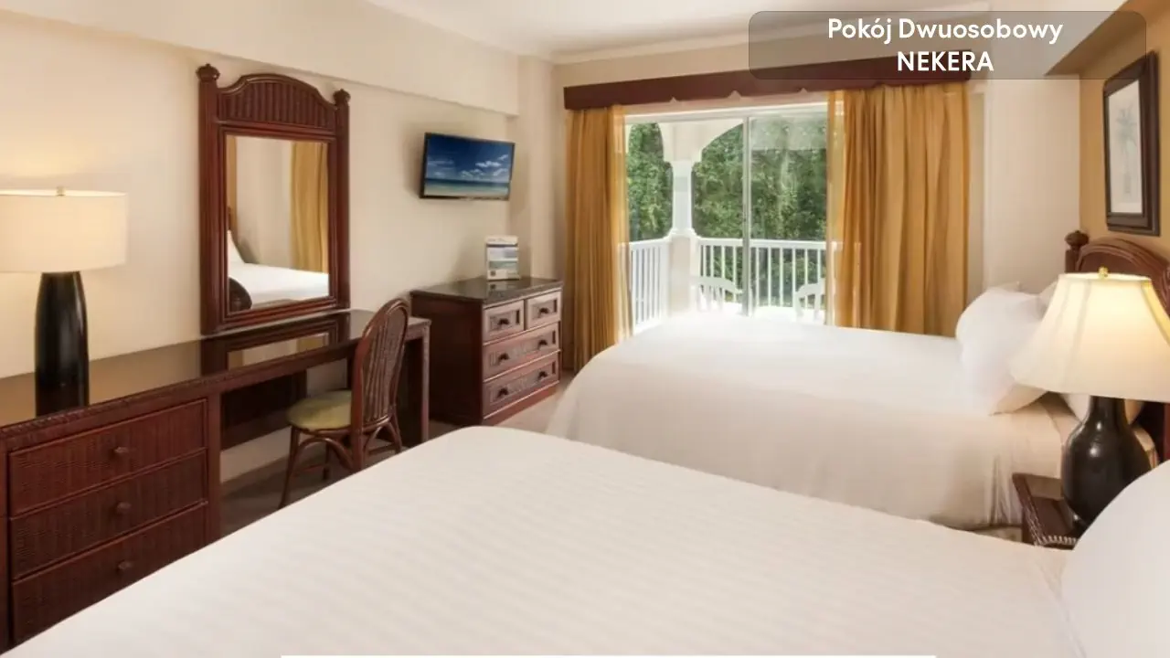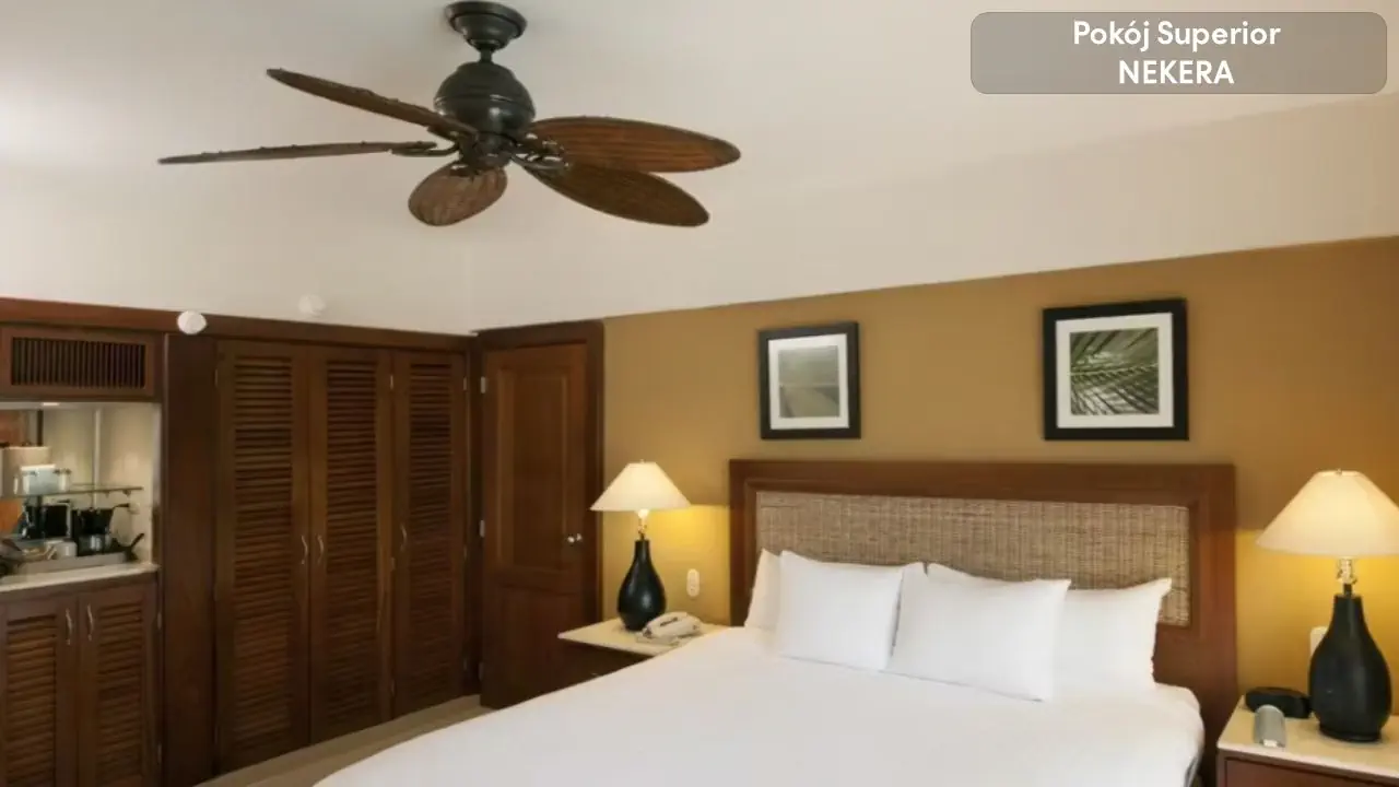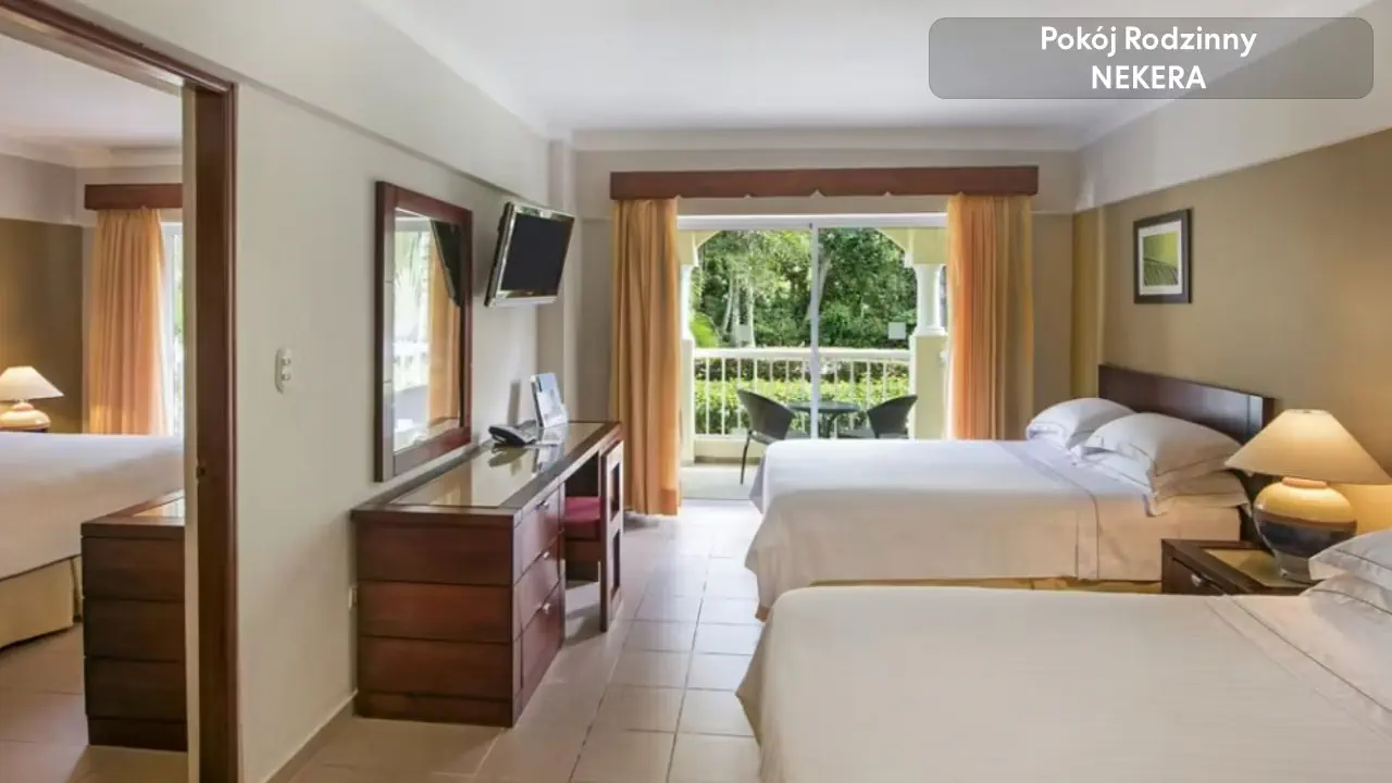Pokój Dwuosobowy - dla maksymalnie 4 osób dorosłych lub 1 osoby dorosłej i 3 dzieci - jedno łóżko podwójne typu King Size, lub dwa łóżka typu king size (w zależności od dostępności) - minibar - sejf - zestaw do kawy i herbaty - żelazko i deska do prasowania - bezpłatne WiFi - TV - klimatyzacja - prywatna łazienka z wanną lub prysznicem i suszarką do włosów - room service (za dodatkową opłatą) Pokój Superior - dla maksymalnie 4 osób dorosłych lub 2 osób dorosłych i maksymalnie 2 dzieci - poza tym wyposażony tak, jak pokój Dwuosobowy. Pokój Rodzinny - dla maksymalnie 4 osób - łóżko king size oraz dwa łóżka podwójne w osobnych pokojach - poza tym wyposażony tak, jak pokój Dwuosobowy Pokoje Dwuosobowe i pokoje Superior występują także z widokiem na Ocean, w zależności od dostępności.
