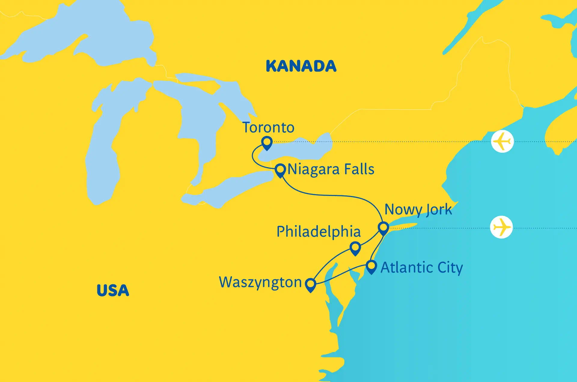 Zakwaterowanie Hotele ***, a także ew. pensjonaty/motele *** wg kategoryzacji Rainbow o średnim standardzie (w USA nie ma oficjalnej kategoryzacji obiektów); zwykle położone poza centrami miast (6 rozpoczętych dób hotelowych: Toronto - 1, Niagara Falls - 1, Nowy Jork - 2, Waszyngton - 1, Atlantic City - 1). Pokoje: 2 - osobowe, możliwe zakwaterowanie max. 3 os. dorosłych ale bez dodatkowego łóżka – pokój wyposażony jest w 2 łóżka dwuosobowe (typu „queen”). Wyżywienie: Śniadania amerykańskie: składają się głównie z produktów słodkich – słodkie bułki, muffiny, pieczywo tostowe, płatki kukurydziane, owoce. Czasami dostępne są „hash browns” – placki ziemniaczane lub ziemniaki na ciepło. Rzadkością są warzywa, sery czy wędlina. Pokoje 2 - osobowe, możliwe zakwaterowanie max. 3 os. dorosłych ale bez dodatkowego łóżka – pokój wyposażony jest w 2 łóżka dwuosobowe (typu „queen”). Do dyspozycji gości W hotelu najczęściej restauracja oraz bar. Wyżywienie Śniadania amerykańskie: składają się głównie z produktów słodkich – słodkie bułki, muffiny, pieczywo tostowe, płatki kukurydziane, owoce. Czasami dostępne są „hash browns” – placki ziemniaczane lub ziemniaki na ciepło. Rzadkością są warzywa, sery czy wędlina.