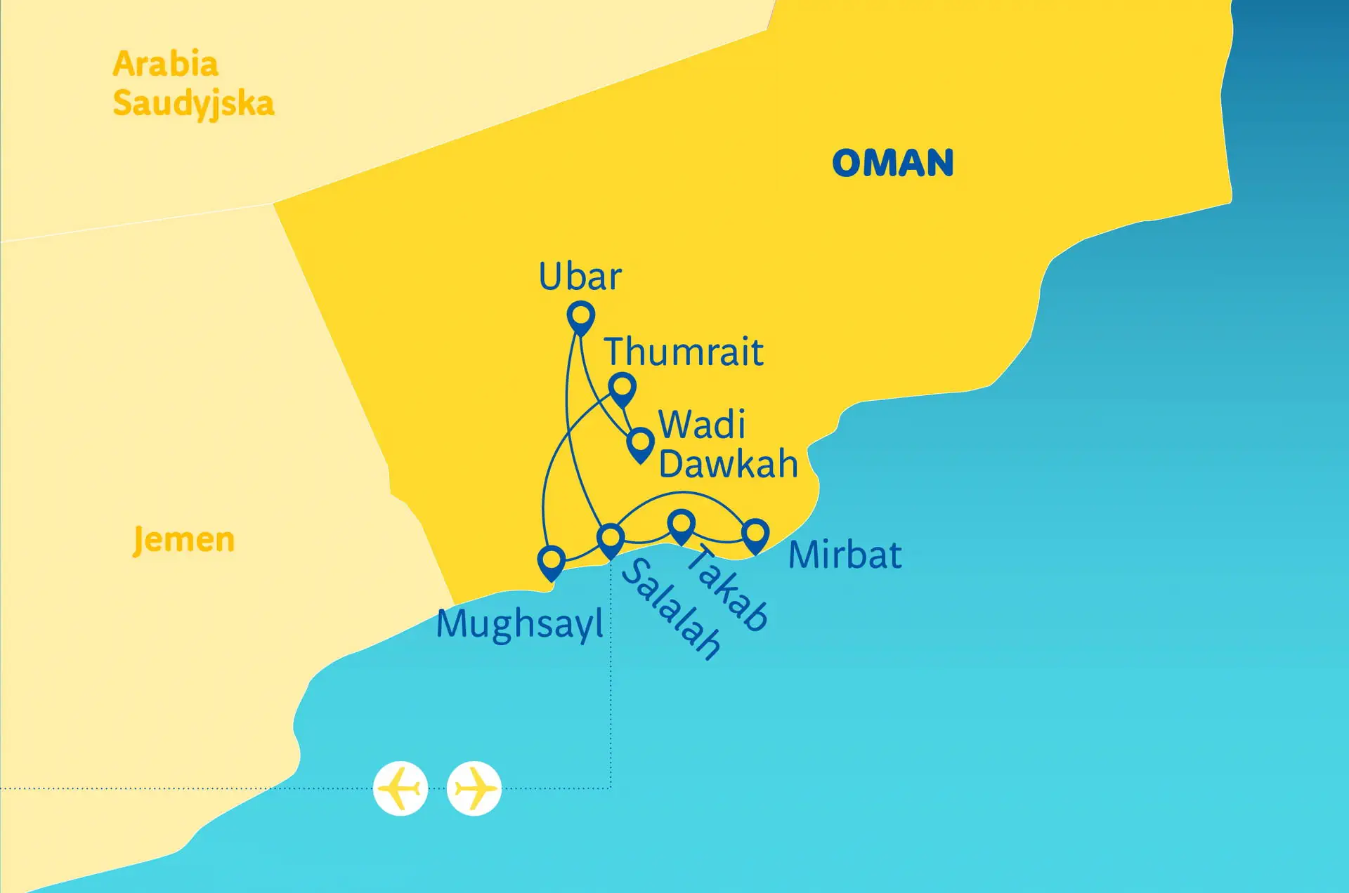 Pokoje wyposażone są w łazienki z WC, klimatyzację, często TV. Wyżywienie Podczas części objazdowej: śniadania (4) oraz obiadokolacja (1) na pustyni, za dopłatą: obiadokolacje (2) we wskazanych dniach, zazwyczaj w restauracjach hotelowych; napoje do kolacji dodatkowo płatne, podczas wypoczynku: zgodnie z opisem wybranego hotelu. Zakwaterowanie Hotele o standardzie odpowiadającym *** lub **** w ocenie organizatora - w Salali lub okolicy podczas części objazdowej: razem 3 rozpoczęte doby hotelowej + 1 doba hotelowa w obozowisku na pustyni (zakwaterowanie w namiotach, łazienki i prysznice na zewnątrz) oraz podczas wypoczynku: 3 rozpoczęte doby hotelowe w wybranym hotelu. Pokoje: w części objazdowej: wyposażone są w łazienki z WC, klimatyzację, często TV, podczas wypoczynku: zgodnie z opisem wybranego hotelu. Wyżywienie: podczas części objazdowej: śniadania (4) oraz obiadokolacja (1) na pustyni, za dopłatą: obiadokolacje (2) we wskazanych dniach, zazwyczaj w restauracjach hotelowych; napoje do kolacji dodatkowo płatne, podczas wypoczynku: zgodnie z opisem wybranego hotelu. Położenie