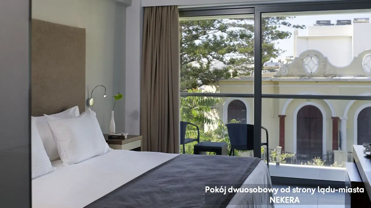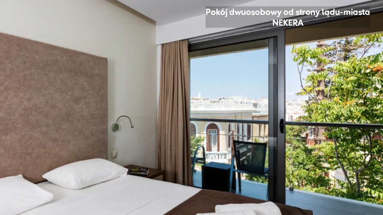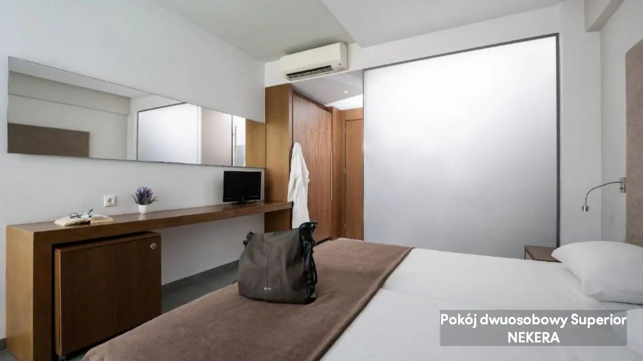 pokój dwuosobowy DOUBLE ROOM od strony lądu: dwa łóżka pojedyncze lub jedno łóżko podwójne; prywatna łazienka (toaleta, lustro, umywalka, prysznic, suszarka do włosów); szlafrok i kapcie; Wi-Fi; telefon; telewizor; sejf (depozyt); mini lodówka; balkon; klimatyzacja. Pokój Dwuosobowy od strony lądu (bez balkonu). Pokój Dwuosobowy SUPERIOR z widokiem na basen. Pokój Dwuosobowy SUPERIOR z widokiem na basen (bez balkonu).