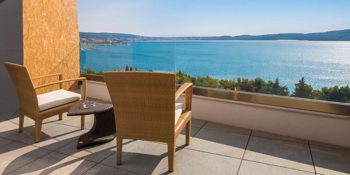 Komfortowy, jeszcze bardziej przestronny, klimatyzowany pokój (37 m2) z widokiem na morze, nowoczesnymi wygodami, wanną w pokoju, łazienką z przestronnym prysznicem oraz balkonem