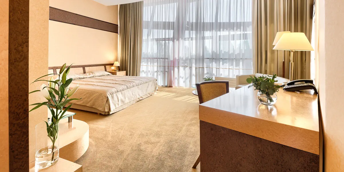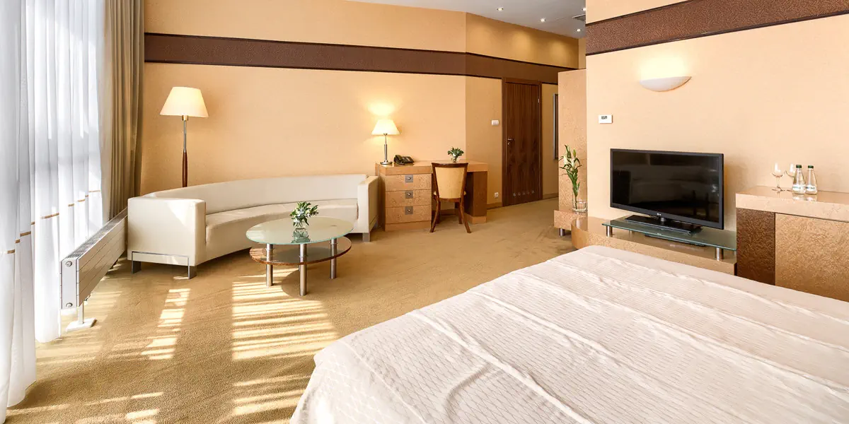 Komfortowy klimatyzowany pokój o powierzchni 40 m2 z kompletem wypoczynkowym i prywatną łazienką