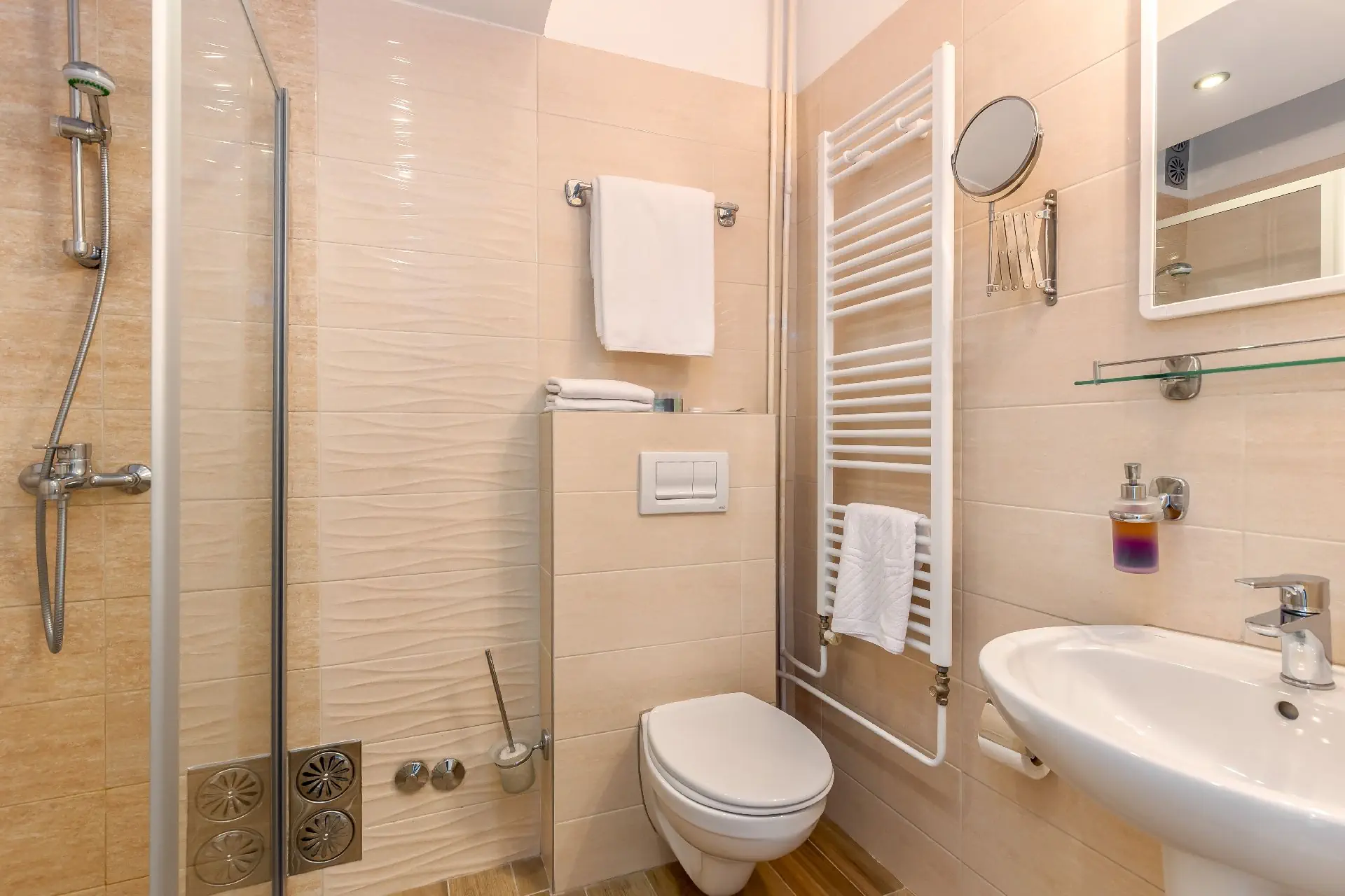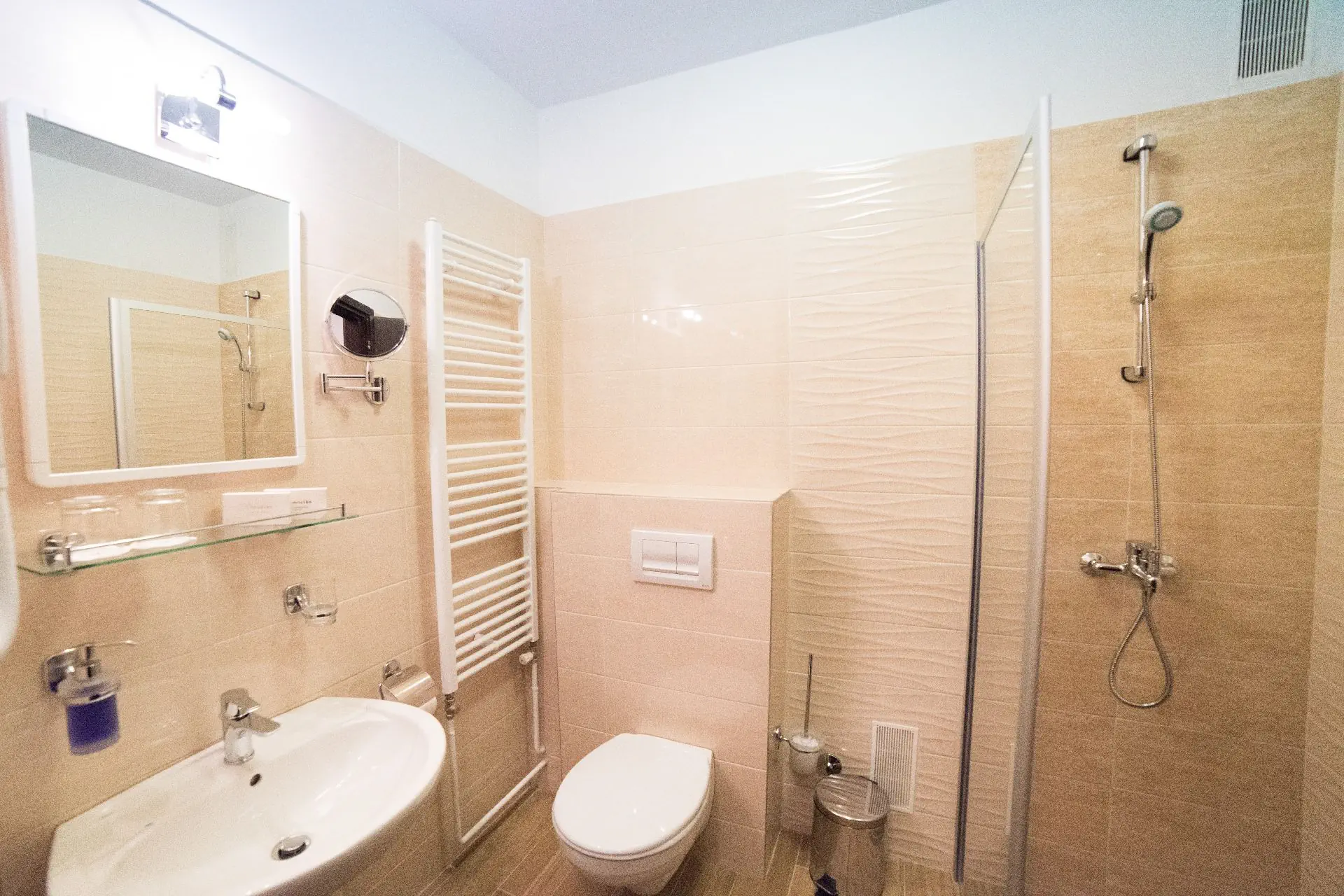 klimatyzacja, internet WiFi (w cenie), LCD SAT-TV, mini-bar (odpłatnie), sejf (w cenie), telefon (odpłatnie), suszarka do włosów, łazienka/WC, balkon / łóżka pojedyncze wysuwane spod łóżka głównego jako dostawki.