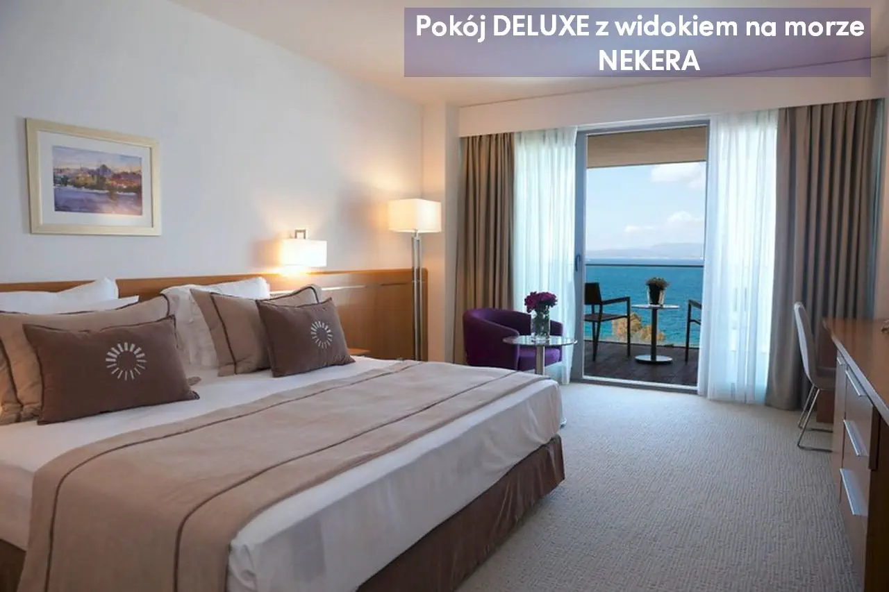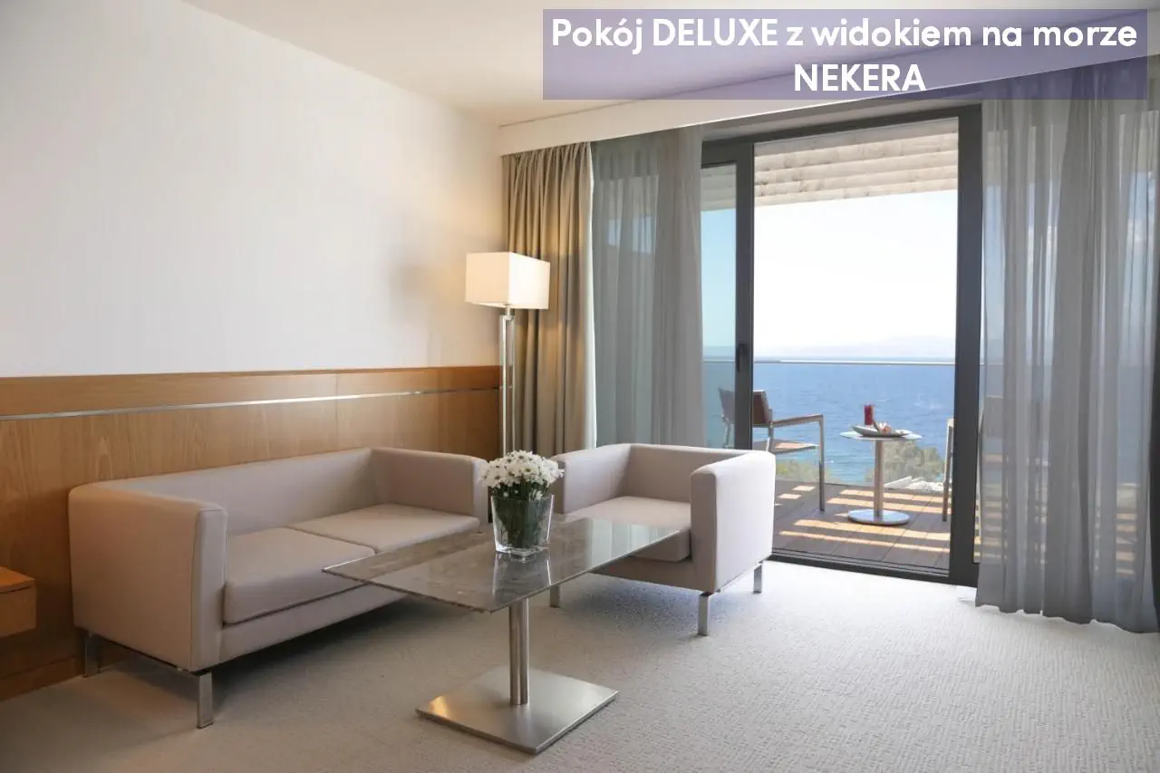 73 pokoje: Pokój Deluxe z widokiem na morze DELUXE SEA VIEW: ok. 35 m2, dla max 2 osób dorosłych i 1 dziecka lub 3 osób dorosłych, łóżko podwójne lub 2 pojedyncze oraz sofa w formie dostawki. Wyposażenie: klimatyzacja centralna, TV, sejf (bezpłatny), minibar (płatny), prywatna łazienka (łazienka z prysznicem, suszarka do włosów, WC), telefon (płatny), Wi-Fi (bezpłatne), zestaw do parzenia kawy/herbaty, balkon. Pokoje promocyjne PROMO ROOM: mogą nie mieć balkonu i różnić się wielkością, lokalizacją lub wyposażeniem od tych znajdujących się w regularnej cenie, dla max 2 osób dorosłych i 1 dziecka lub 3 osób dorosłych.