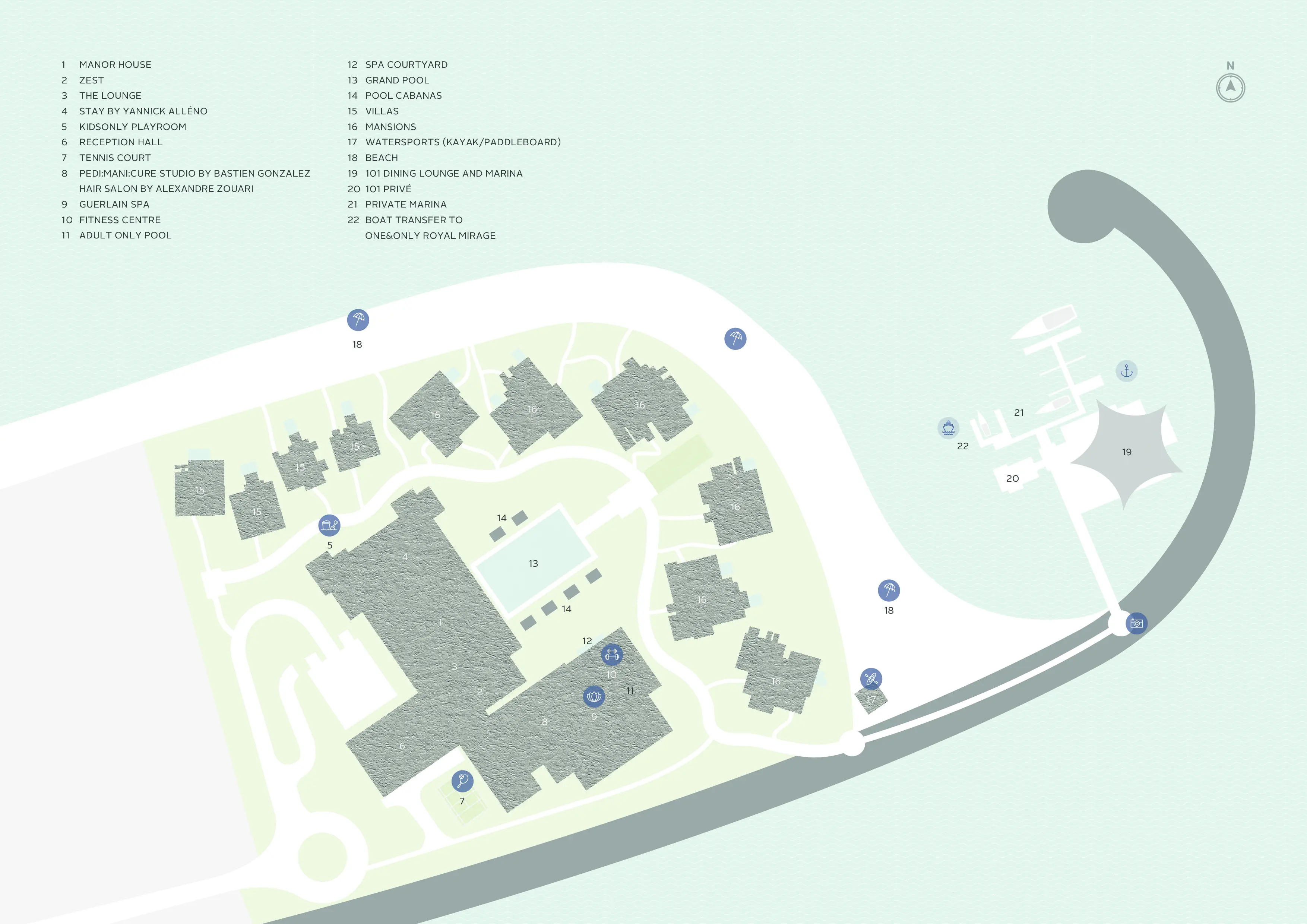 Korty do tenisa ziemnego, Oświetlenie kortów, Rakiety i piłki do tenisa ziemnego, Lekcje tenisa ziemnego ¹⁾, Tenis stołowy, Koszykówka, Narty wodne ¹⁾, Parasailing ¹⁾, Kitesurfing ¹⁾, Kajaki ¹⁾, Siłownia ¹⁾ - dodatkowo płatne