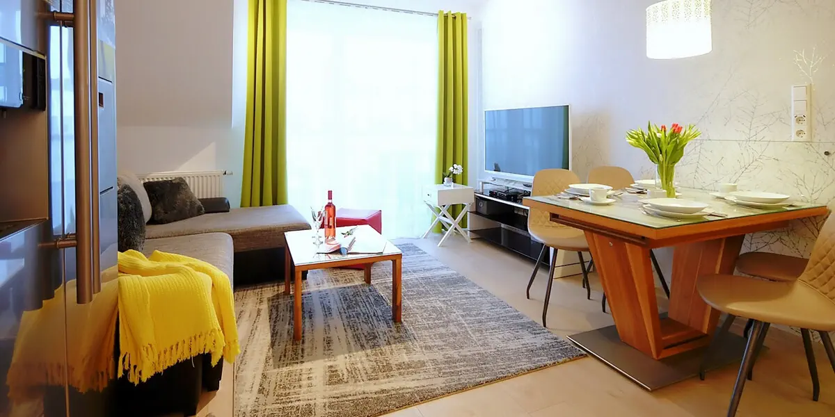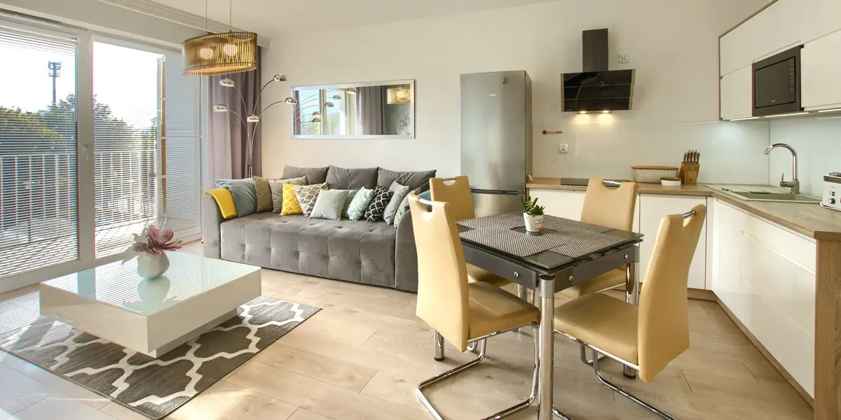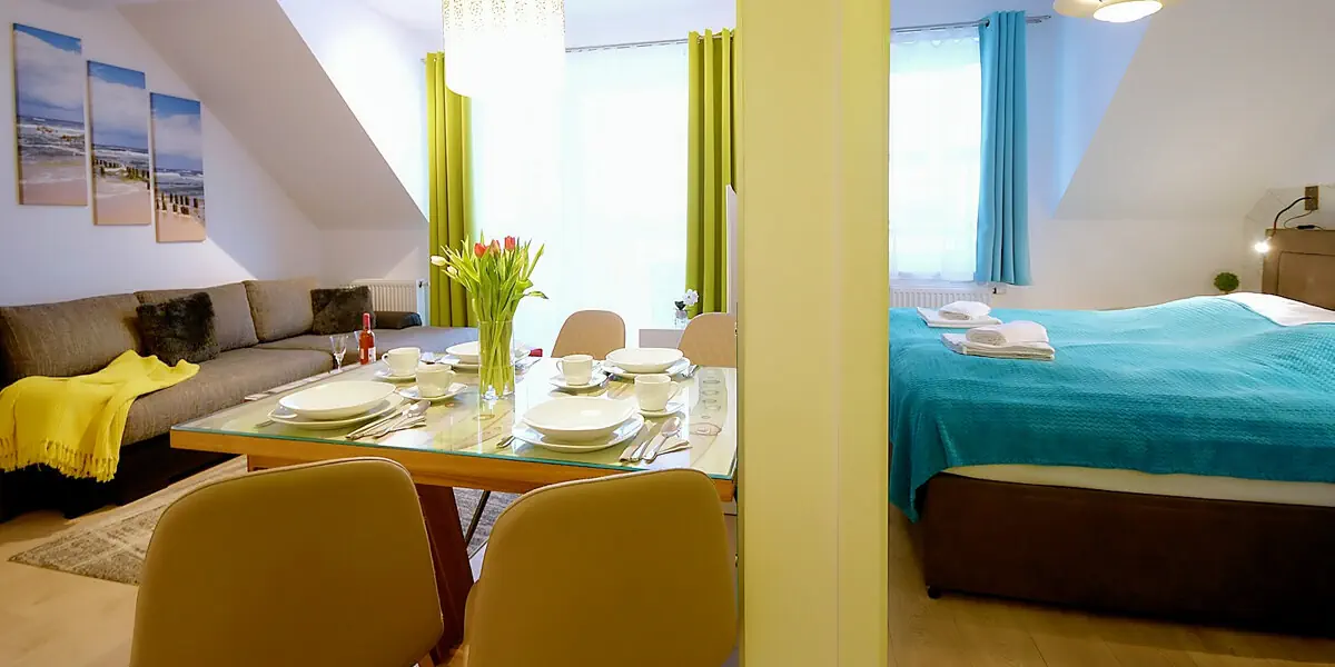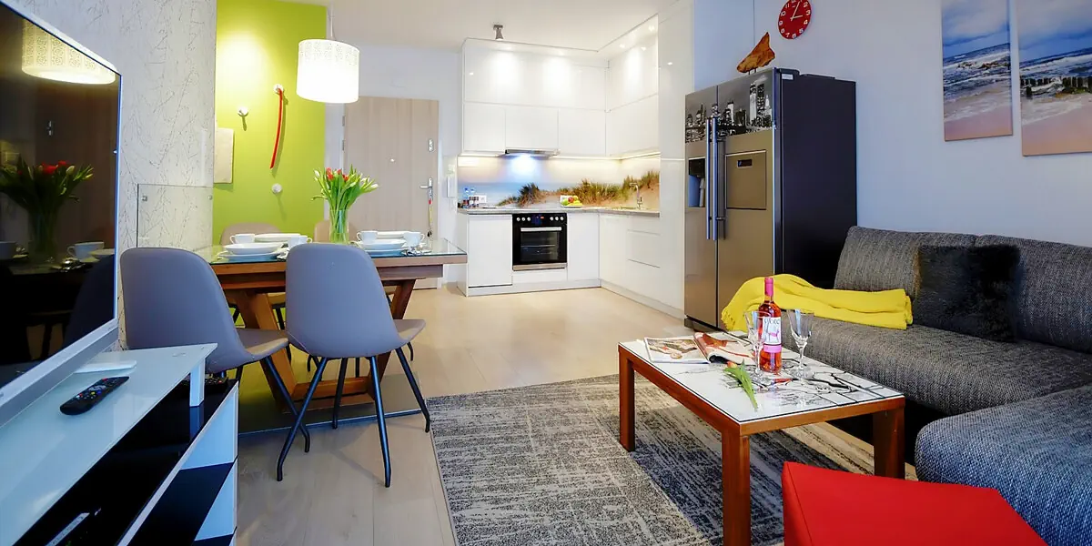 Komfortowy 2-pokojowy apartament z kompleksowym wyposażeniem. Pokój dzienny z sofą, nowoczesnym aneksem kuchennym, kącikiem jadalnianym i wyjściem na balkon, odrębna sypialnia oraz łazienka. W wyposażeniu: część wypoczynkowa, smart TV, wifi, zmywarka do naczyń, lodówka, ekspres do kawy, czajnik, płyta indukcyjna, pralka, prysznic, ręczniki, suszarka do włosów