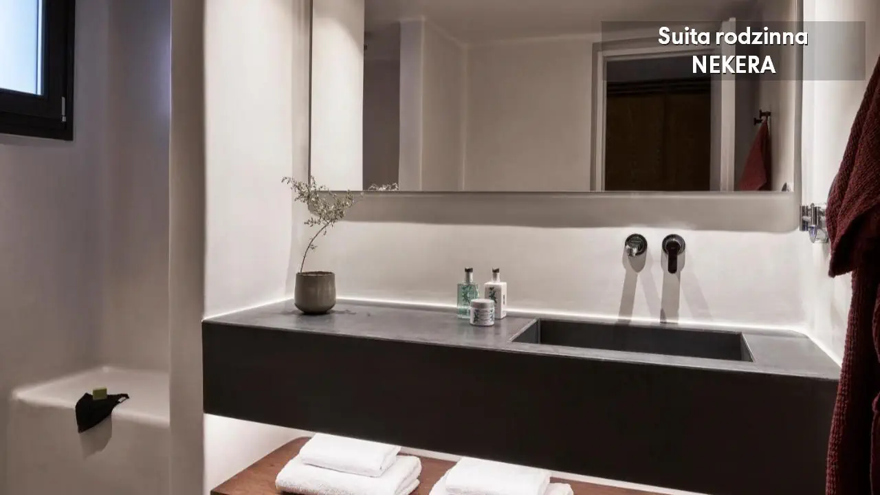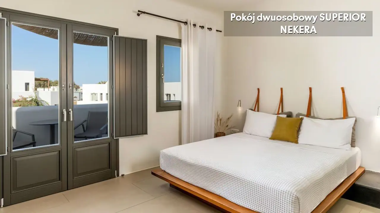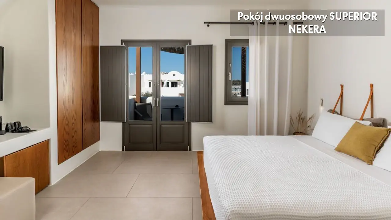 POKÓJ DWUOSOBOWY SUPERIOR • ok. 23 m² • maks. 2 osoby dorosłe i dziecko • łóżko podwójne lub dwa pojedyncze • klimatyzacja • TV-Sat. • telefon (płatny) • minilodówka • zestaw do parzenia kawy/herbaty • zestaw do prasowania • łazienka z prysznicem/wanną • suszarka do włosów • minikosmetyki • balkon z widokiem na basen/ogród POKÓJ z WIDOKIEM NA MORZE DELUXE • ok. 20 m² • maks. 2 osoby dorosłe • łóżko podwójne lub dwa pojedyncze • wyposażony jak pokój superior • balkon z widokiem na kalderę/morze SUITA JUNIOR • ok. 30 m² • maks. 3 osoby dorosłe i dziecko • pokój na otwartym planie • łóżko podwójne lub dwa pojedyncze oraz sofa • wyposażony jak pokój superior SUITA • ok. 30 m² • maks. 3 osoby dorosłe i dziecko • łóżko podwójne (sypialnia) lub dwa pojedyncze oraz sofa (salon) • wyposażony jak pokój superior SUITA RODZINNA • ok. 42 m² • maks. 4 osoby dorosłe i dziecko • łóżko podwójne (sypialnia) lub dwa pojedyncze (salon) • wyposażony jak pokój superior