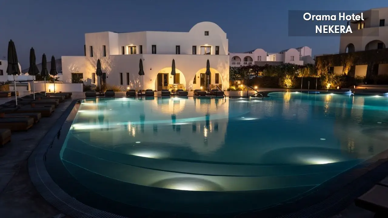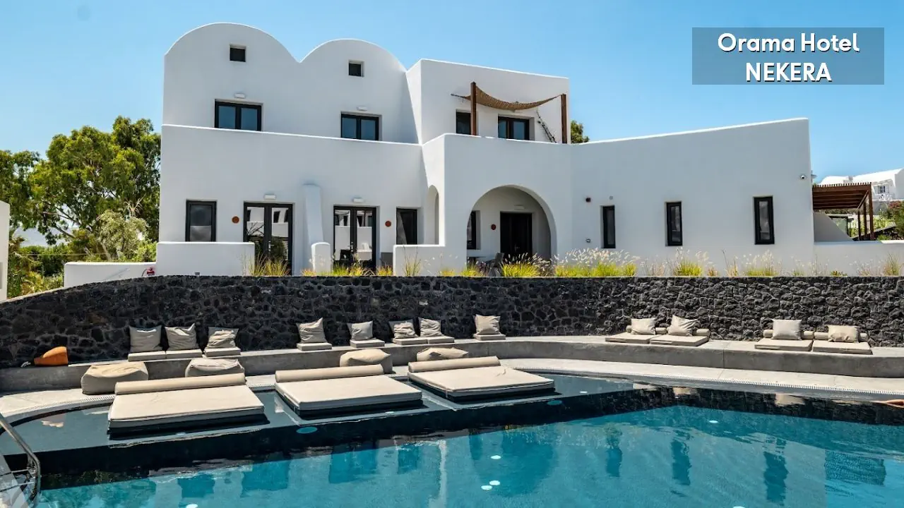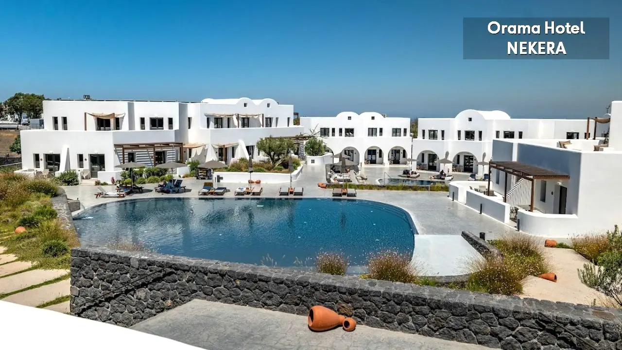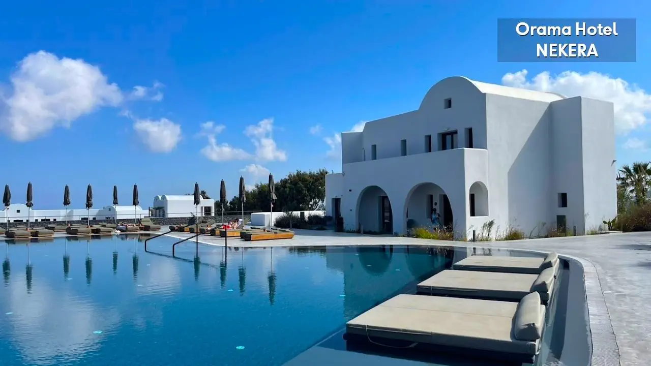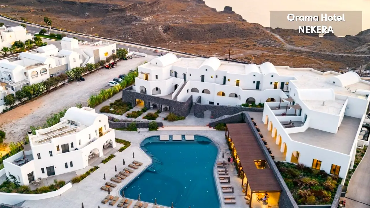 Orama na Santorini to elegancki hotel, który zapewnia komfortowy pobyt w sercu wyspy. Goście mogą cieszyć się nowoczesnymi pokojami z przepięknymi widokami na Morze Egejskie lub okoliczne wulkaniczne krajobrazy. Hotel oferuje basen, strefę wellness oraz restaurację serwującą lokalne i międzynarodowe dania. Dzięki doskonałej lokalizacji, w pobliżu popularnych plaż i atrakcji turystycznych, Orama to świetne miejsce na relaksujący wypoczynek na Santorini.