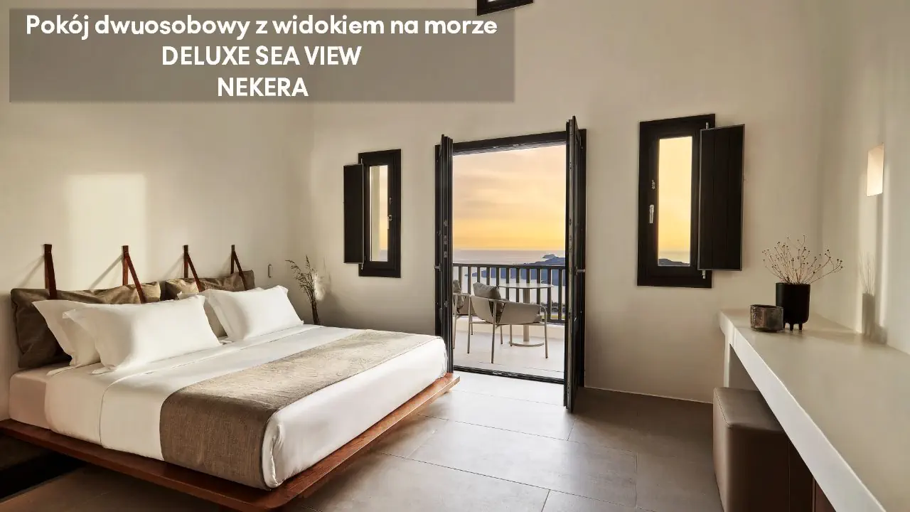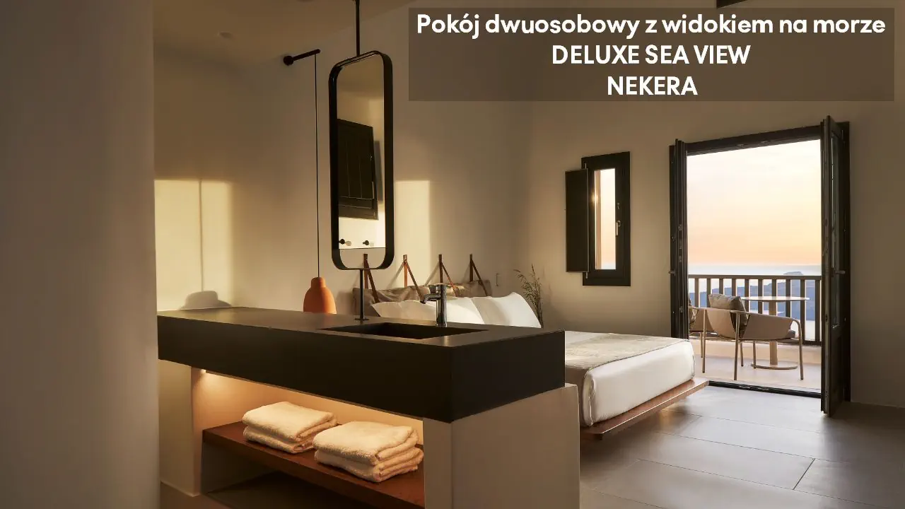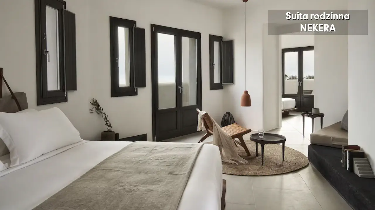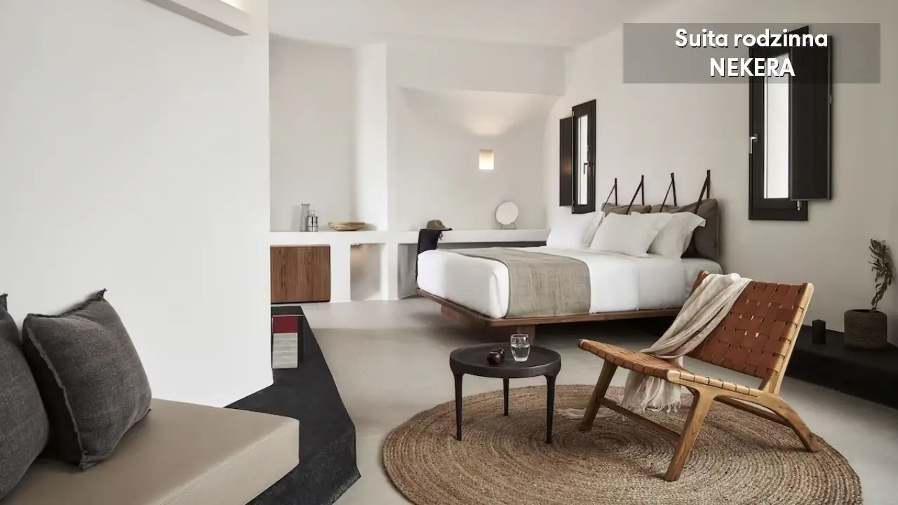 • pięciogwiazdkowy, otwarty w 2022 r. • 97 pokoi • 6 budynków (2 piętra) • cykladzka architektura • recepcja 24h • lobby • ogród • dla wymagających