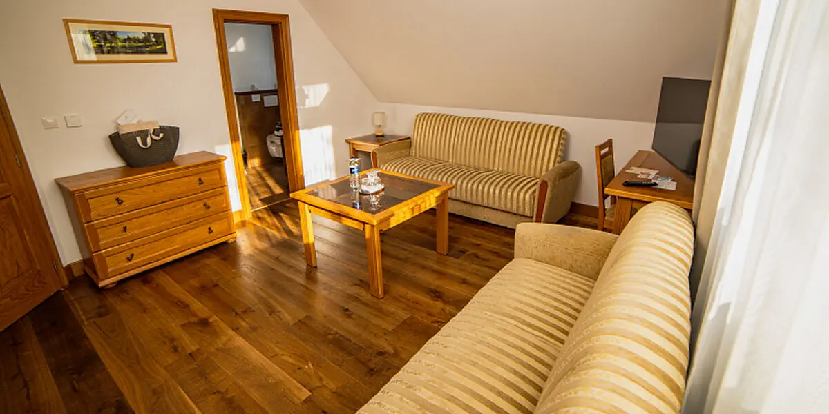 - Codzienne śniadanie w formie bufetu - Codzienna obiadokolacja w formie bufetu - Welcome drink dla dorosłych - Minidegustacja win dla dorosłych - Dostęp do basenu wewnętrznego i jacuzzi - Dostęp do saun (4 rodzaje) i basenu chłodzącego - Dostęp do basenu zewnętrznego i jacuzzi w miesiącach letnich - Animacje dla dzieci (wg harmonogramu hotelu) - Dostęp do pokoju gier z bilardem - Wypożyczenie rowerów i hulajnóg, zimą sanek - Sala zabaw dla dzieci - 10% rabat na napoje - 10% rabatu na masaże - Bezpłatny parking - Internet Wi-Fi - Podatek VAT