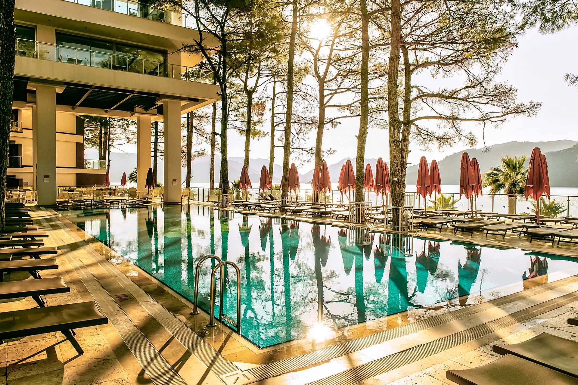 Położenie Hotel usytuowany jest w jednej z najpiękniejszych zatok Morza Egejskiego, otoczony z jednej strony lazurowymi wodami, a z drugiej śródziemnomorskim lasem piniowym. Obiekt położony jest około 2 km od Icmeler oraz około 6 km od rozrywkowego Marmaris. Hotel znajduje się w odległości około 90 km od lotniska w Dalamanie. Plaża Plaża przy hotelu. Przejście na plażę przez promenadę. Piaszczysta, prywatna. Bezpłatne ręczniki, leżaki, materace i parasole. Do dyspozycji gości Recepcja 24h/7. 7 basenów, w tym basen relaksacyjny, basen kryty, splash park; bezpłatne ręczniki, leżaki i parasole. Atrakcje dla dzieci: aquapark z 5-ma zjeżdżalniami. Taras słoneczny.Restauracje: restauracja główna, 3 restauracje a’la carte: włoska oraz turecka (możliwość skorzystania bezpłatnie 1x na pobyt, do wyboru turecka lub włoska, wymagana rezerwacja), chińska (płatna ok. 20 EUR/os.); kawiarnia, 8 barów, w tym za dodatkową opłatą: Tapas Snack, Aqua Snack, Olive Snack, Azul Beach. Pozostałe usługi za dodatkową opłatą: room service, sklepy, fryzjer, salon piękności, usługi opiekunki dla dzieci. Wyżywienie Rodzaje wyżywienia i posiłki: Ultra All Inclusive: Śniadanie: 07:00 - 10:00. Późne śniadanie: 10:00 - 11:00. Lunch: 12:30 - 14:30. Obiadokolacja: 19:00 - 21:30; posiłki w formie urozmaiconego bufetu.Popołudniowe i nocne przekąski: 23:00 - 01:00. Lody. Bary: Lobby bar: lokalne napoje bezalkoholowe i alkoholowe oraz niektóre napoje importowane, napoje gorące i ciastka dostępne 24 h. Pozostałe informacje: Płatne dodatkowo: pozostałe importowane napoje bezalkoholowe i alkoholowe, napoje butelkowane i soki ze świeżych owoców. Program sportowy i animacyjny Dla każdego: siatkówka plażowa, aqua aerobik, piłkarzyki, rzutki, boccia, siłownia, wieczory przy muzyce na żywo. Tylko dla dorosłych: sauna i łaźnia turecka w centrum SPA (wymagana rezerwacja). Dla dzieci: mini disco, plac zabaw. Za dodatkową opłatą: masaże i zabiegi w centrum SPA, sporty wodne przy plaży, lekcje nurkowania. Internet Bezpłatny Internet Wi-Fi na terenie całego hotelu. Kategoria lokalna ***** Naszym zdaniem Nowoczesny, elegancki hotel z pięknymi widokami na zatokę, szerokim wyborem restauracji oraz komfortowo wyposażonymi pokojami. Polecamy Gościom, którzy cenią sobie odpoczynek w luksusie i w formule Ultra All Inclusive. Również nasi najmłodsi Goście znajdą tu atrakcje dla siebie, gwarantujące niezapomniany wypoczynek w rodzinnej, wakacyjnej atmosferze. Strona www www.orkahotels.com