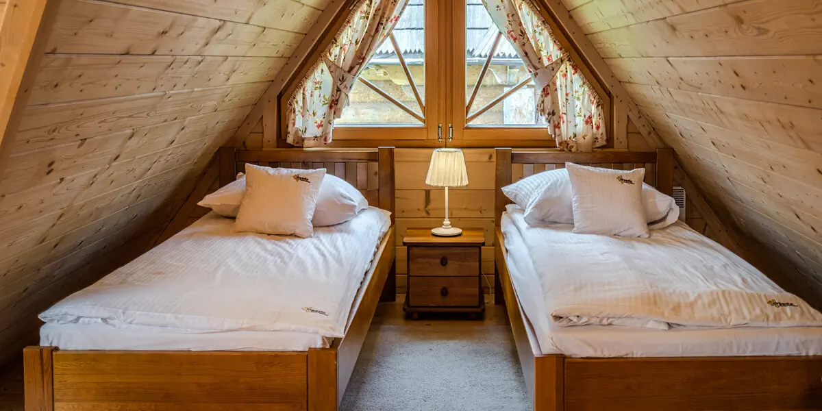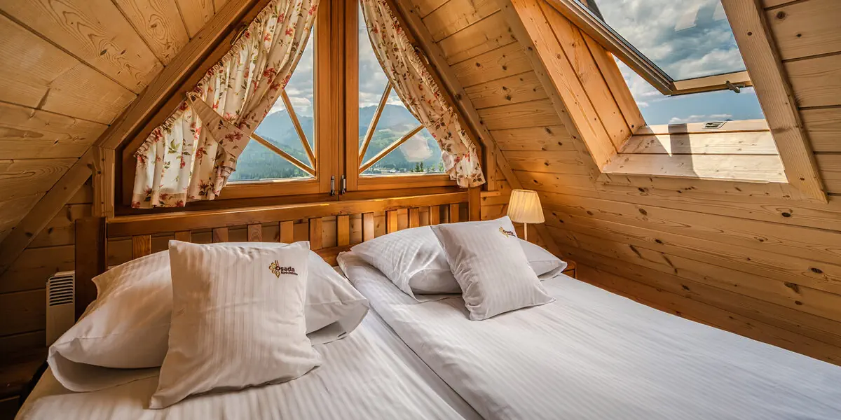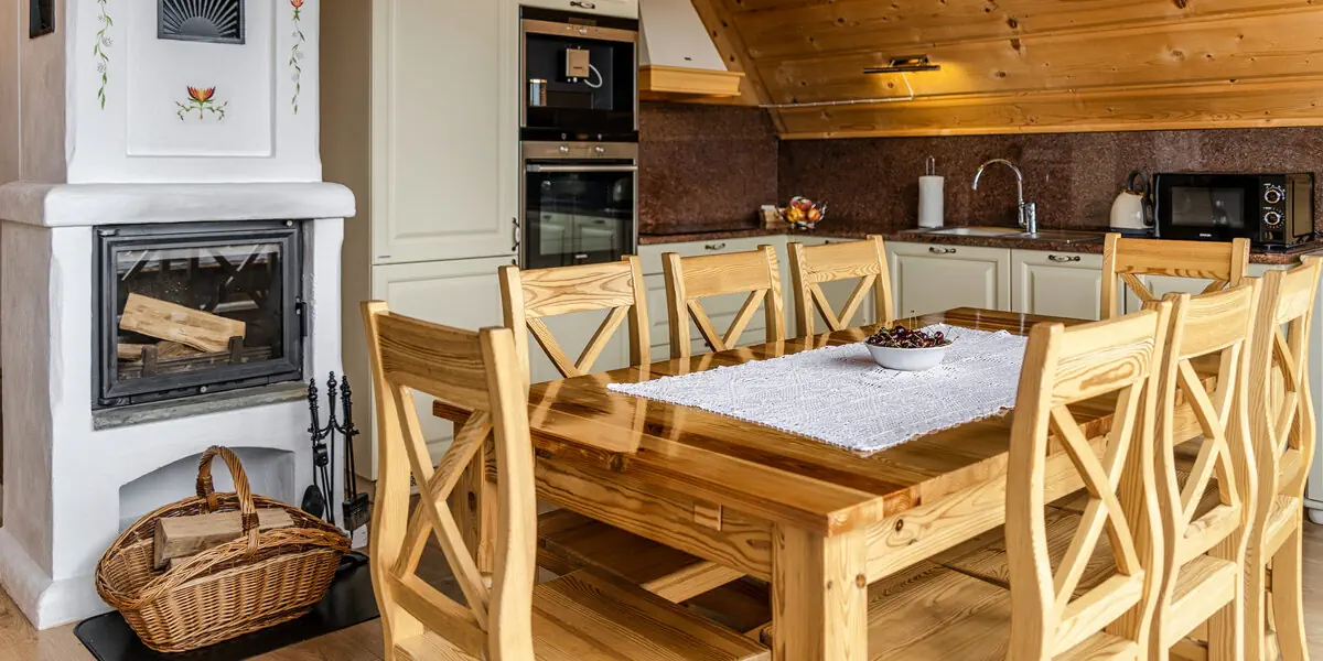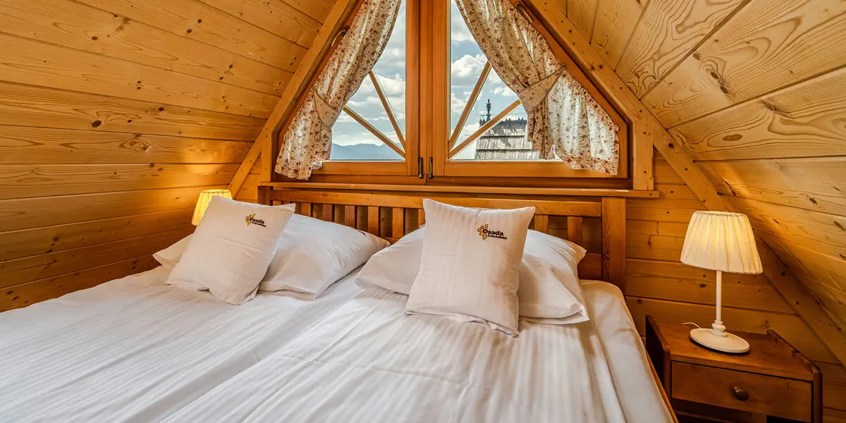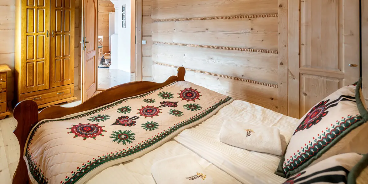 Apartament (72 m2) na piętrze góralskiego domku: 3 sypialnie na antresoli, salon z aneksem kuchennym, kominkiem i panoramicznym oknem, taras, łazienka, stylowe góralskie dodatki. W kuchni: zmywarka, piekarnik, lodówka, zamrażarka, kawiarka, czajnik.