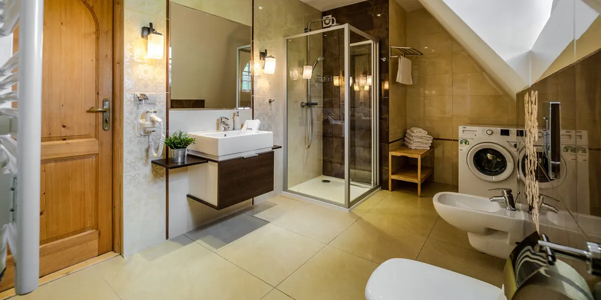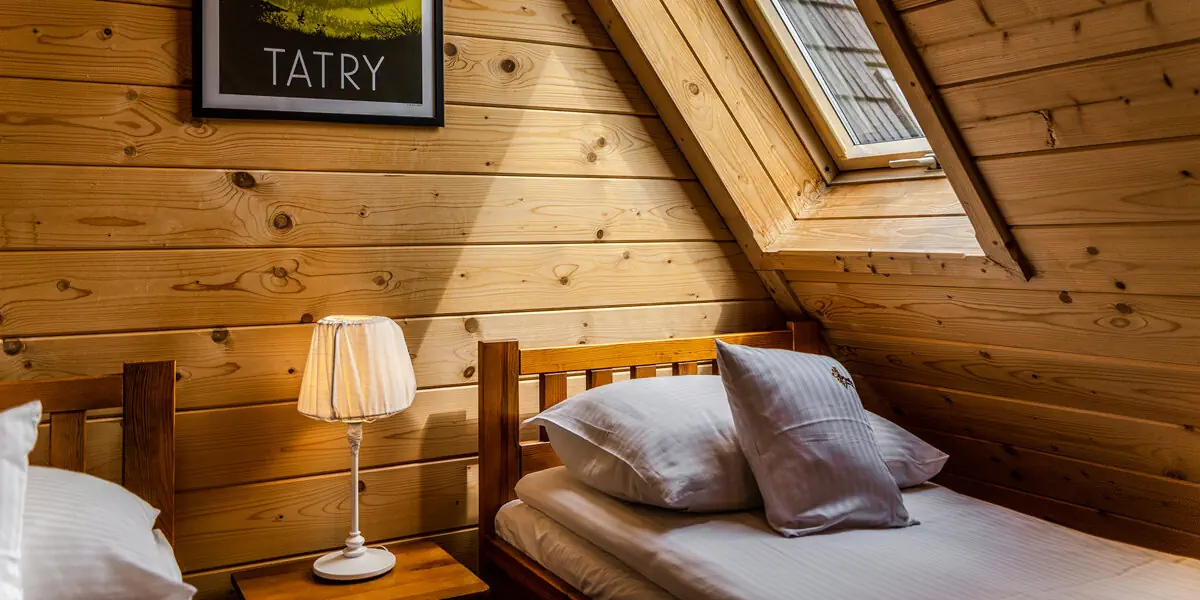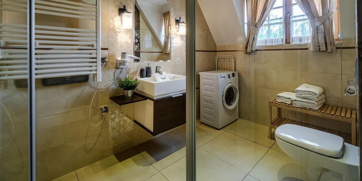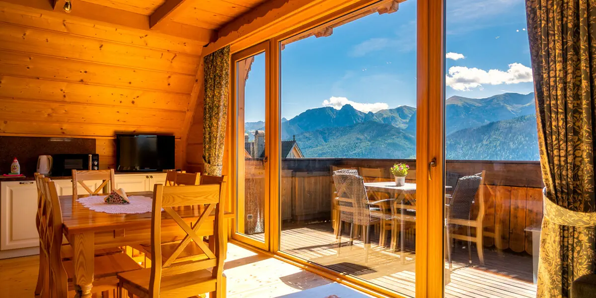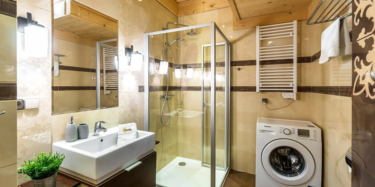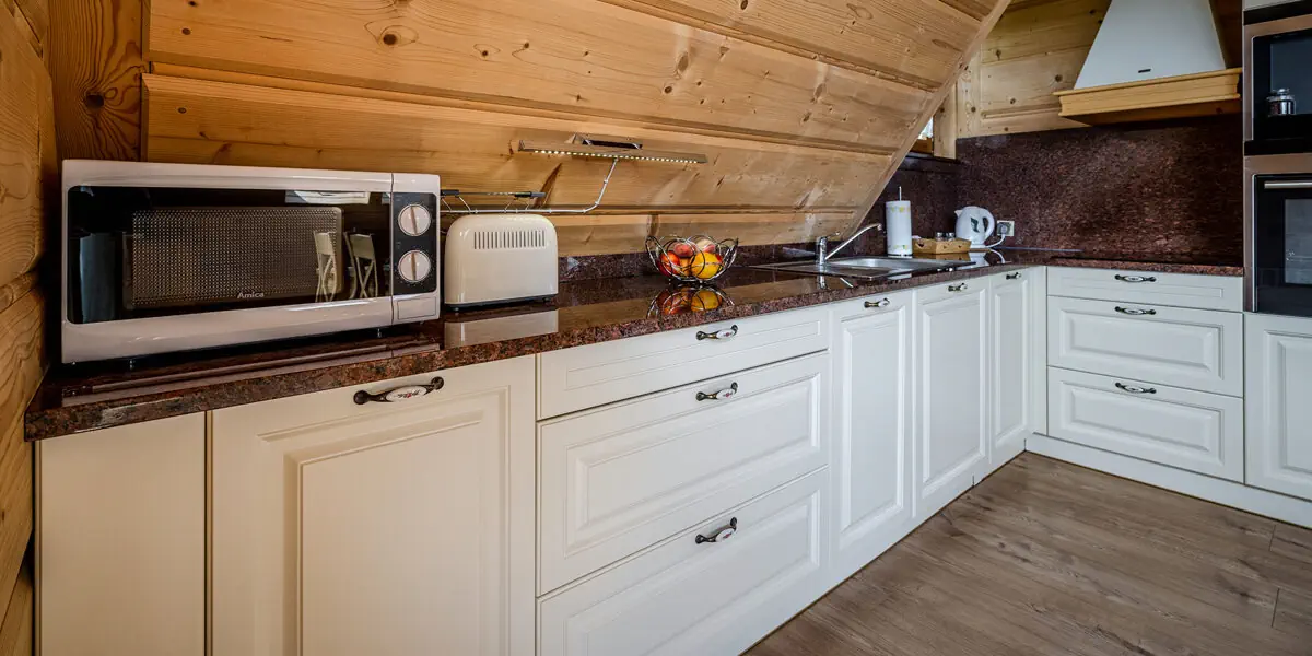 Apartament (72 m2) na piętrze góralskiego domku: 3 sypialnie na antresoli, salon z aneksem kuchennym, kominkiem i panoramicznym oknem, taras, łazienka, stylowe góralskie dodatki. W kuchni: zmywarka, piekarnik, lodówka, zamrażarka, kawiarka, czajnik.