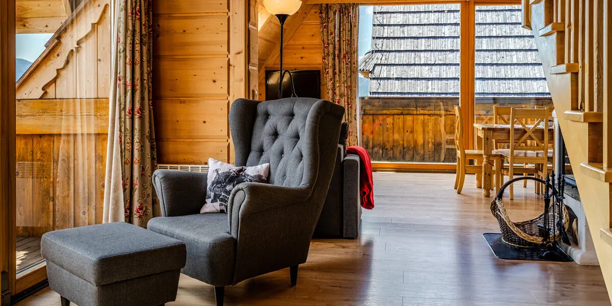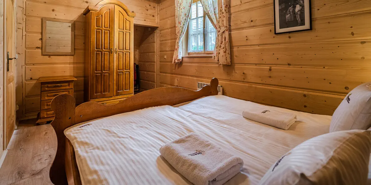 Apartament (67 m2) na piętrze góralskiego domku: 2 sypialnie na antresoli, salon z aneksem kuchennym, kominkiem i panoramicznym oknem, 2 balkony, łazienka, stylowe góralskie dodatki. W kuchni: zmywarka, piekarnik, lodówka, zamrażarka, kawiarka, czajnik.