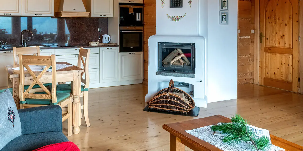 Apartament (52 m2) na parterze góralskiego domku: 1 sypialnia, salon z aneksem kuchennym, kominkiem i panoramicznym oknem, taras, łazienka, stylowe góralskie dodatki. W kuchni: zmywarka, piekarnik, lodówka, zamrażarka, kawiarka, czajnik.