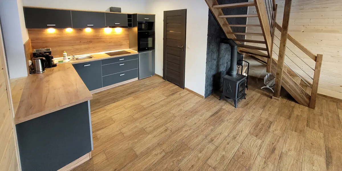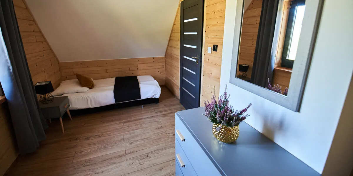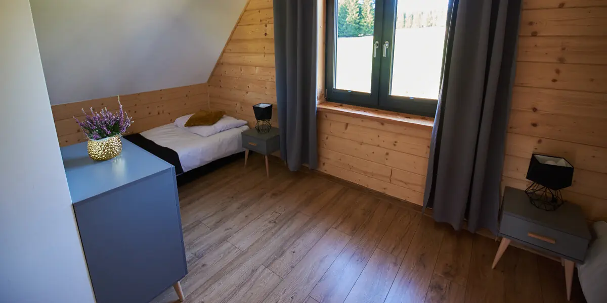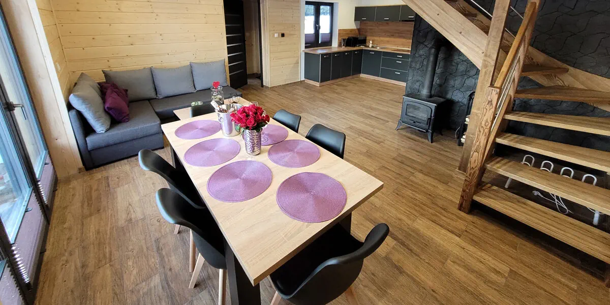 Komfortowy dwupoziomowy domek z pełnym wyposażeniem. Na parterze salon z kominkiem, sofą, TV, aneks kuchenny i łazienka z prysznicem, na piętrze 2 sypialnie. Dodatkowo taras z grillem elektrycznym i przedsionek do przechowania nart
