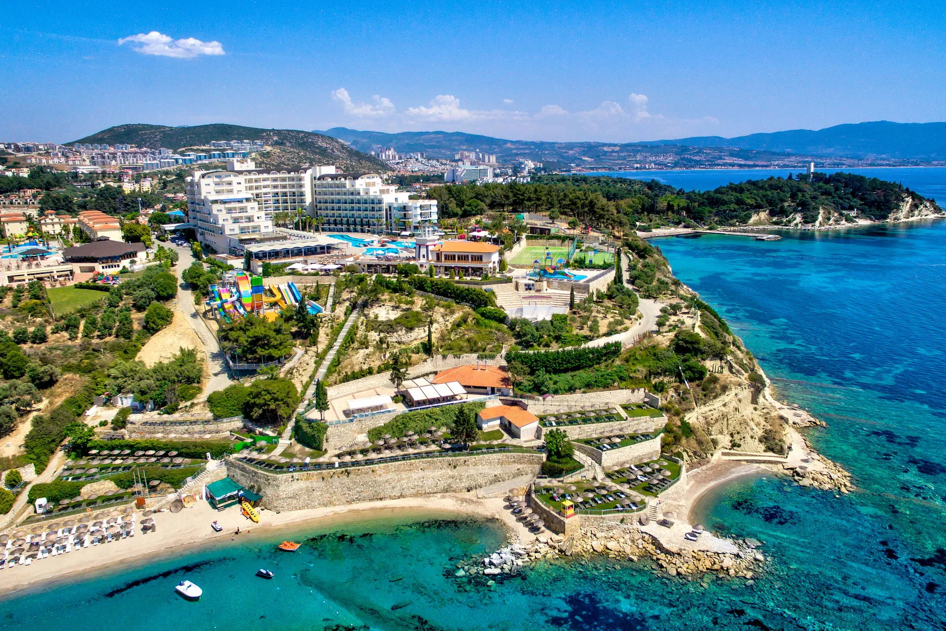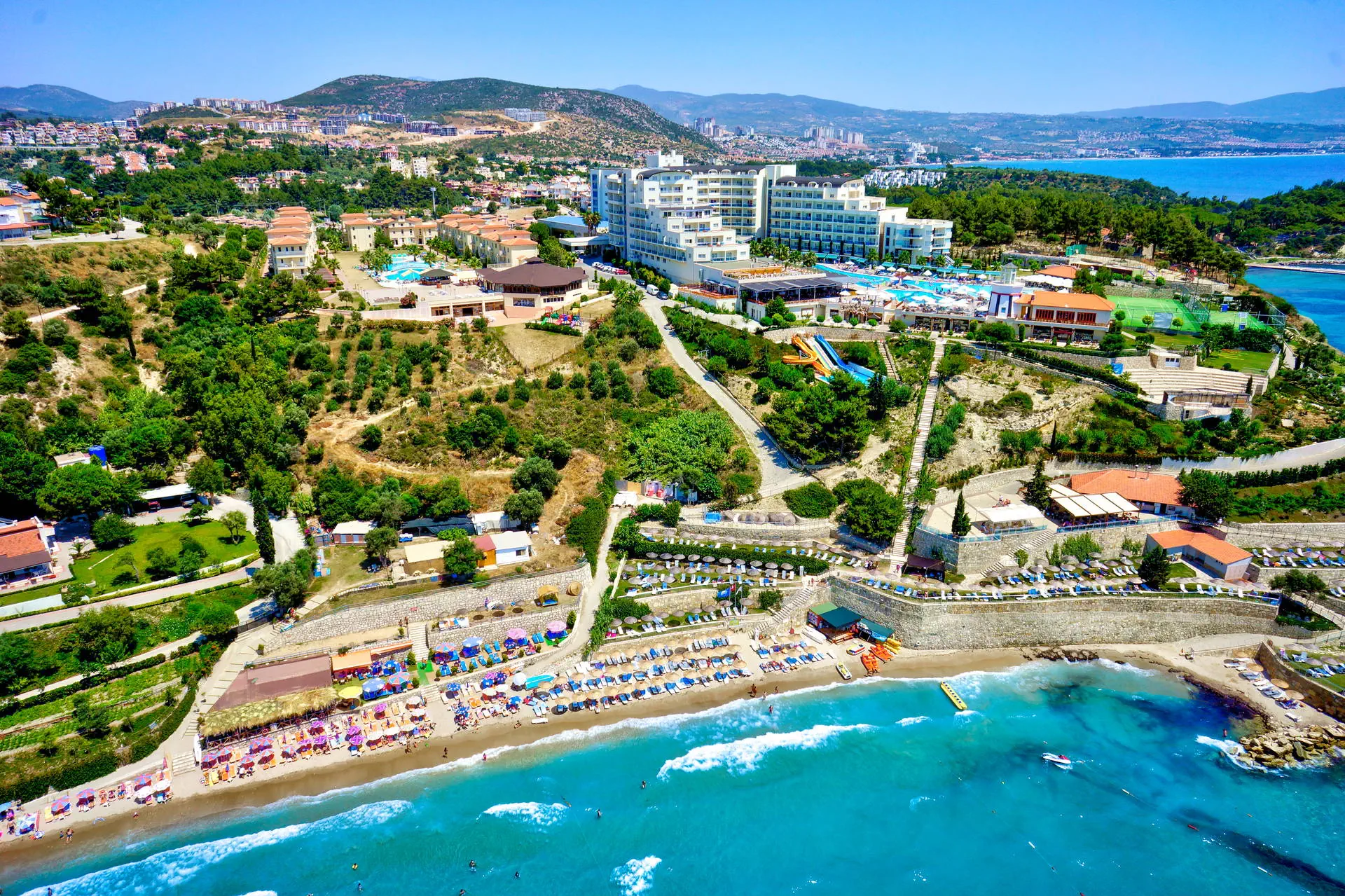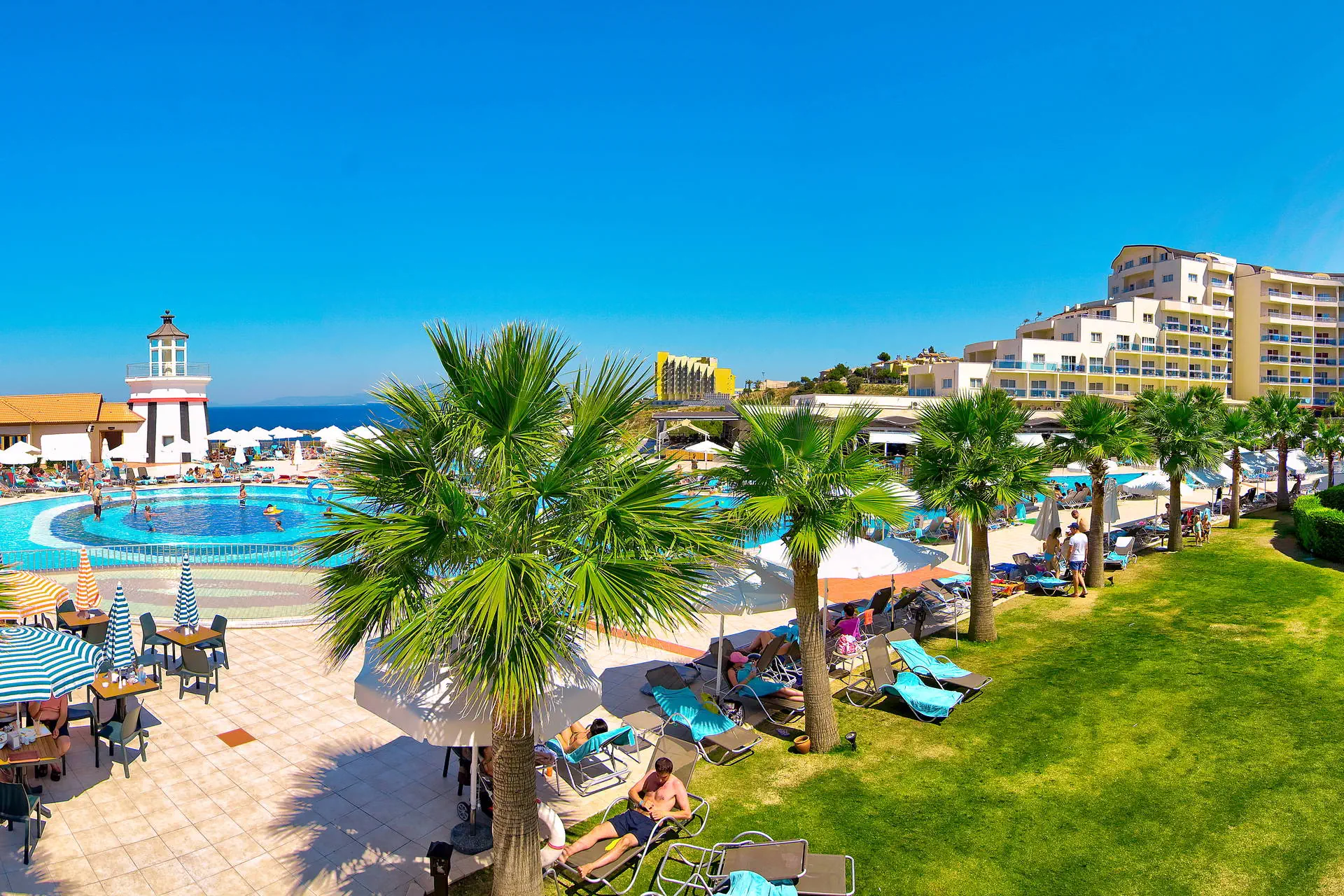 Położenie Obiekt znajduje się około 5 km od centrum Kusadasi, gdzie można znaleźć liczne sklepy, restauracje i bary. Historyczny Efez oddalony jest o około 25 km od miejsca zakwaterowania. Hotel położony jest około 130 km od lotniska w Bodrum. Plaża 300-metrowa piaszczysta plaża z łagodnym zejściem do wody. Leżaki, parasole i ręczniki dostępne bezpłatnie. Na plażę można dojść po schodach lub skorzystać z hotelowego busa (09:00-18:00). Do dyspozycji gości Recepcja 24h/7, przestronne lobby, 6 wind. 3 baseny: bardzo duży o nieregularnych kształtach, jeden ze zjeżdżalniami (czynne w określonych godzinach), basen ze słoną wodą oraz brodzik dla dzieci. Taras słoneczny przy basenie z bezpłatnymi leżakami, parasolami i ręcznikami. Atrakcje dla dzieci: brodzik dla dzieci. Restauracje: restauracja główna z panoramicznymi widokami, 5 restauracji à la carte: kebab, z owocami morza, meksykańska, azjatycka oraz śródziemnomorska (dostępna 1 bezpłatnie raz na pobyt, wymagana rezerwacja, otwarte będą w zależności od obłożenia hotelu), 6 barów m.in.: bar przy basenie, bar przy plaży, w lobby. Wyżywienie Rodzaje wyżywienia i posiłki: Ultra All Inclusive: Śniadanie: 07:00 - 10:00. Późne śniadanie: 10:00 - 10:30. Lunch: 12:30 - 14:00. Obiadokolacja: 19:00 - 21:30; posiłki w formie urozmaiconego bufetu.Bufet dla dzieci: 12:00 - 14:00 oraz 18:30 - 21:30. Przekąski w ciągu dnia w wybranych barach. Kawa, herbata, ciasta i lody: 12:00 - 19:00. Przekąska nocna: zupa i makaron: 24:00 - 05:00. Bary: Neopolis Bar: lokalne napoje bezalkoholowe i alkoholowe 24 h. Pozostałe bary: lokalne napoje bezalkoholowe i alkoholowe w godzinach ich otwarcia. Pozostałe informacje: Za opłatą: pozostałe napoje importowane, świeżo wyciskane soki, kawa po turecku. Program sportowy i animacyjny Dla każdego: zabawy i gry przy basenie, wieczorne show, muzyka na żywo, kort tenisowy, koszykówka, siatkówka, siłownia, joga, łucznictwo, mini piłka nożna, mini golf, rowery wodne, sauna. Dla dzieci: mini klub hotelowy. Za dodatkową opłatą: tenis stołowy, kręgle, bilard, oświetlenie kortu, sporty wodne, zabiegi i masaże w centrum SPA. Internet Bezpłatny Internet Wi-Fi w lobby oraz w pokojach. Kategoria lokalna ***** Naszym zdaniem Elegancki hotel, którego kaskadowe położenie gwarantuje wspaniałe widoki. Polecamy osobom nastawionym na aktywny wypoczynek dzięki bogatym animacjom oraz bliskości turystycznego Kusadasi. Dodatkowym atutem jest dobre jedzenie i bogata formuła Ultra All Inclusive. Strona www www.sealighthotel.com
