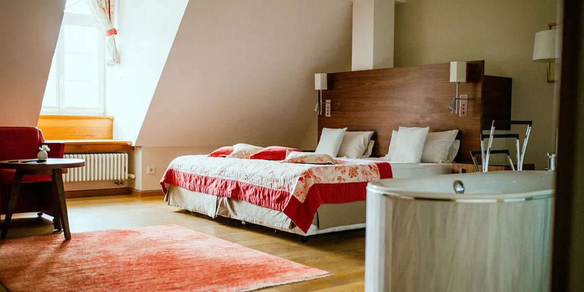 Nowoczesny pokój z widokiem na staw. Mieści się na parterze lub piętrze nowego budynku hotelowego położonego nad stawami i połączonego z historyczną częścią hotelu. Przestrzenny i słoneczny pokój jest indywidualnie zaaranżowany, posiada zintegrowaną z pokojem łazienkę z prysznicem. Z dostawki na sofie może skorzystać 1 osoba dorosła lub 2 dzieci