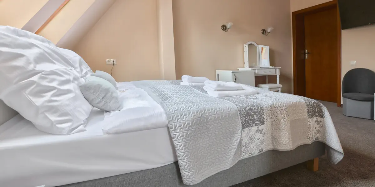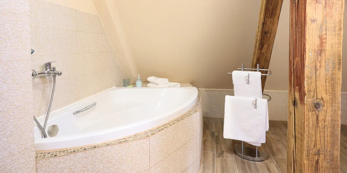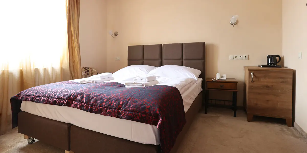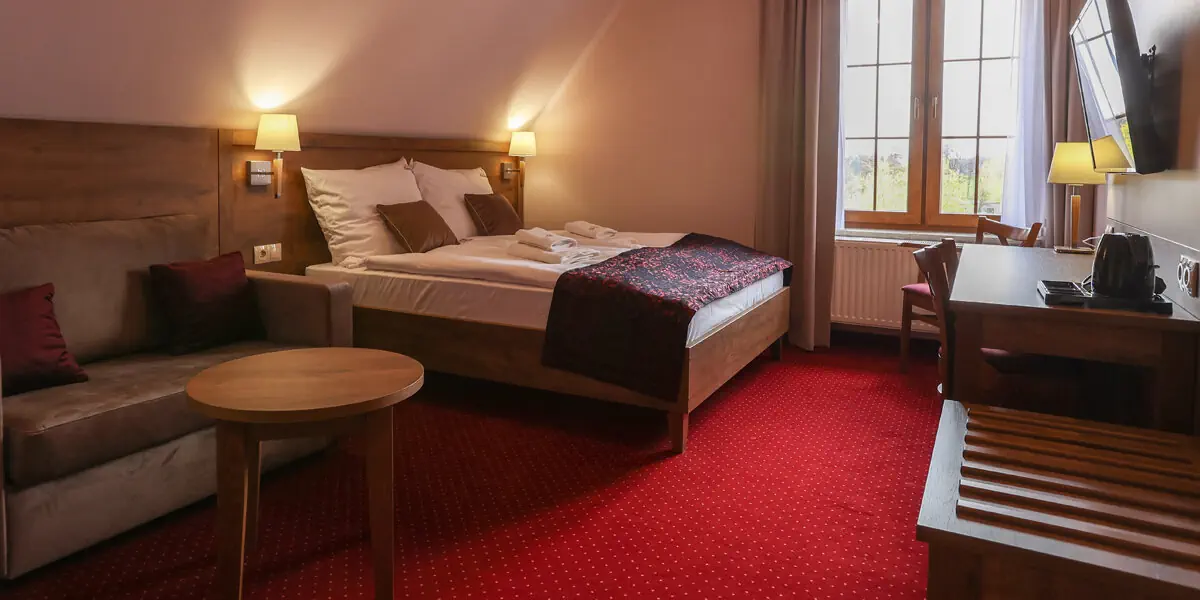 Nowoczesny pokój z łazienką. W wyposażeniu: czajnik, mini bar, TV, wifi, łazienka z prysznicem lub wanną, suszarką do włosów, ręcznikami, kosmetykami