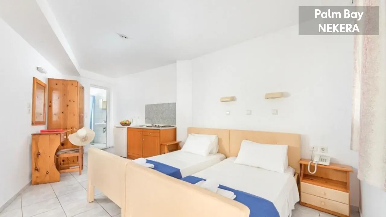 pokój dwuosobowy STUDIO: 15 m²;jedno łóżko podwójne lub dwa łóżka pojedyncze: prywatna łazienka (toaleta, lustro, umywalka, prysznic, suszarka do włosów); aneks kuchenny; Wi-Fi; telefon; balkon lub patio; klimatyzacja (dostępna za dodatkowa opłatą. Pokój trzyosobowy STUDIO: dwa łóżka pojedyncze i jedna rozkładana sofa lub jedno łóżko podwójne i jedna rozkładana sofa. Pokój czteroosobowy STUDIO: dwie rozkładane sofy i jedno łóżko podwójne. APARTAMENT z sypialnią: 2 rozkładane sofy w salonie i 1 duże łóżko podwójne w sypialni. APARTAMENT z dwoma sypialniami: jedno łóżko podwójne w jednej sypialni i dwa łóżka pojedyncze w drugiej sypialni.