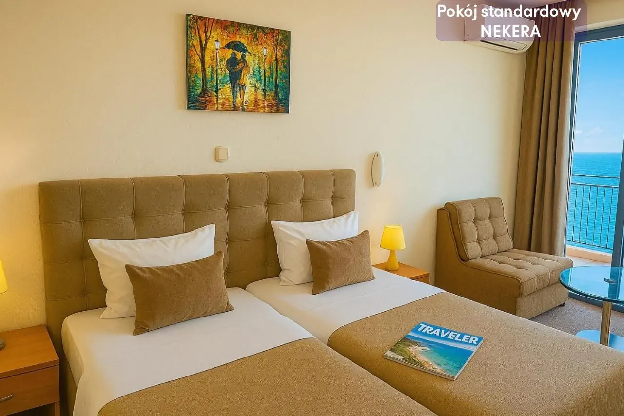 Powierzchnia ok. 20 m² Klimatyzacja Telewizor z kanałami satelitarnymi Telefon Mini lodówka Łazienka z wanną lub prysznicem Balkon z widokiem na park lub morze (w zależności od opcji)