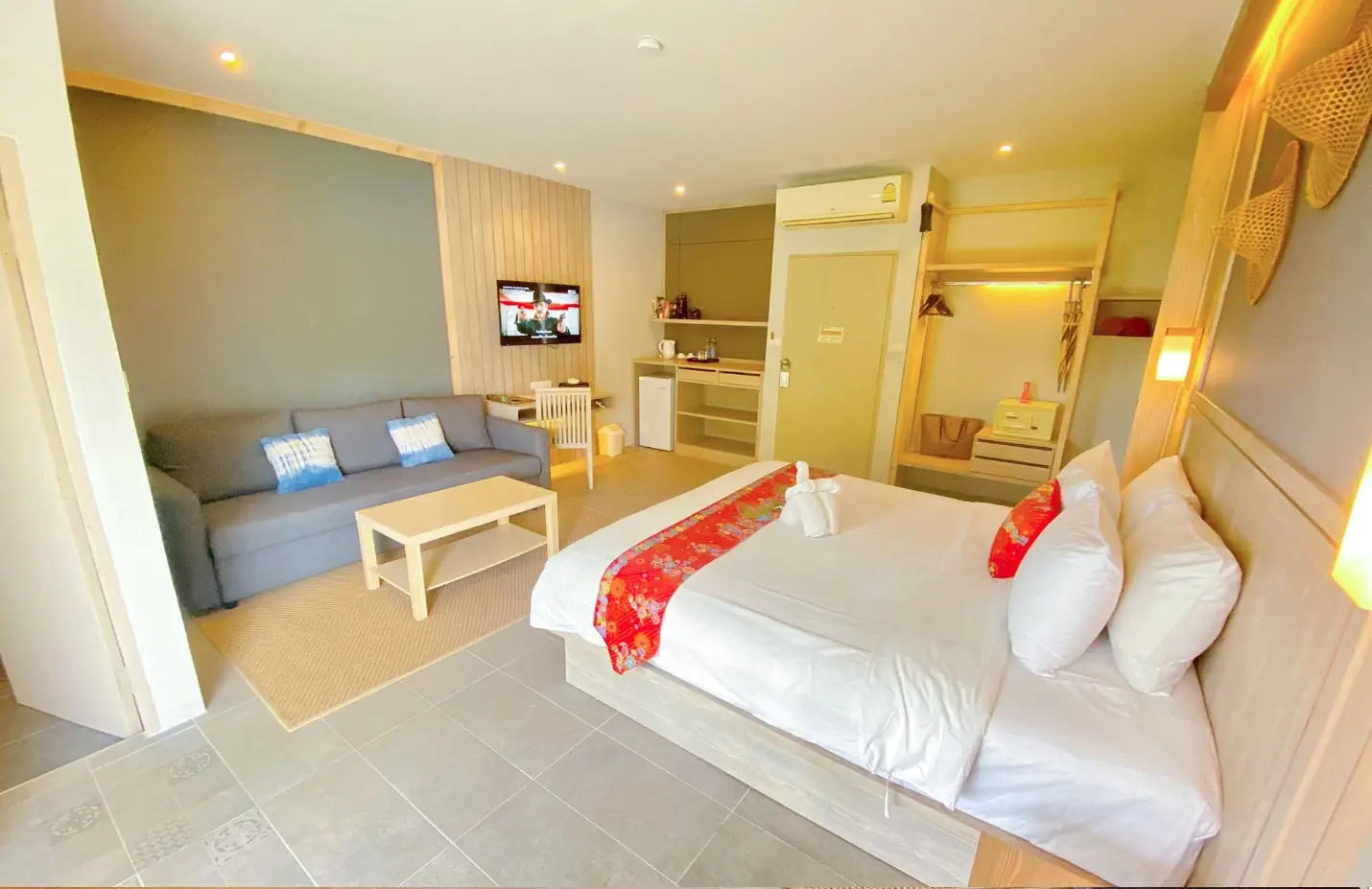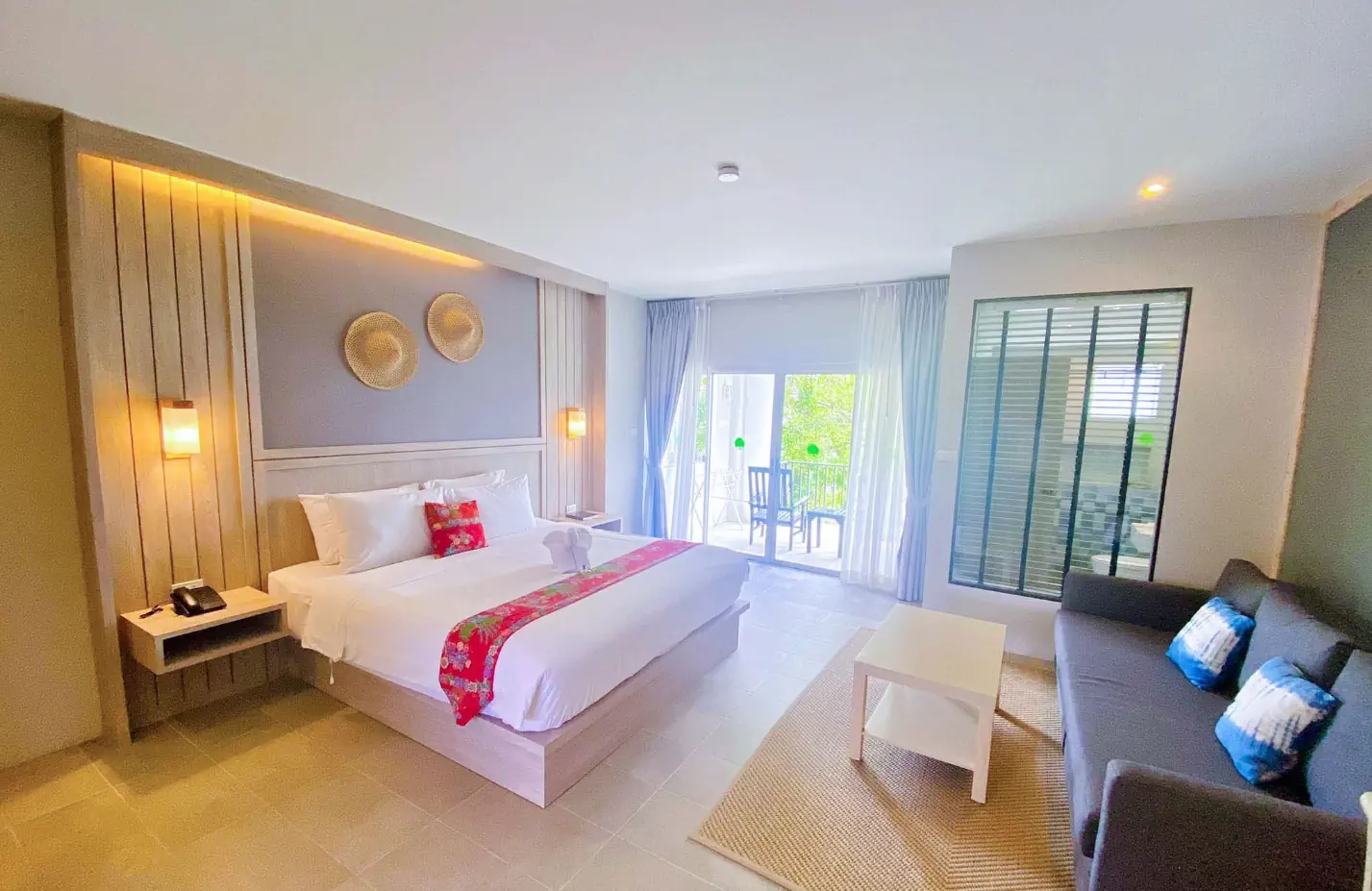 Dla max. 3 osób, Przestrzeń zewnętrzna: Balkon, Kanały telewizji: Angielski, prysznic, Powierzchnia pokoju: ok. 45 m2, Dostawka: łóżko rozkładane, Rodzaj podłogi: płytki, Sprzątanie codziennie, 1 sypialnia, Maksymalna liczba osób dorosłych: 3, Maksymalna liczba dzieci: 2, Widok na ogród, Liczba łazienek: 1, Liczba toalet: 1, Zestaw do parzenia kawy i herbaty, Klimatyzacja: Klimatyzacja indywidualna
