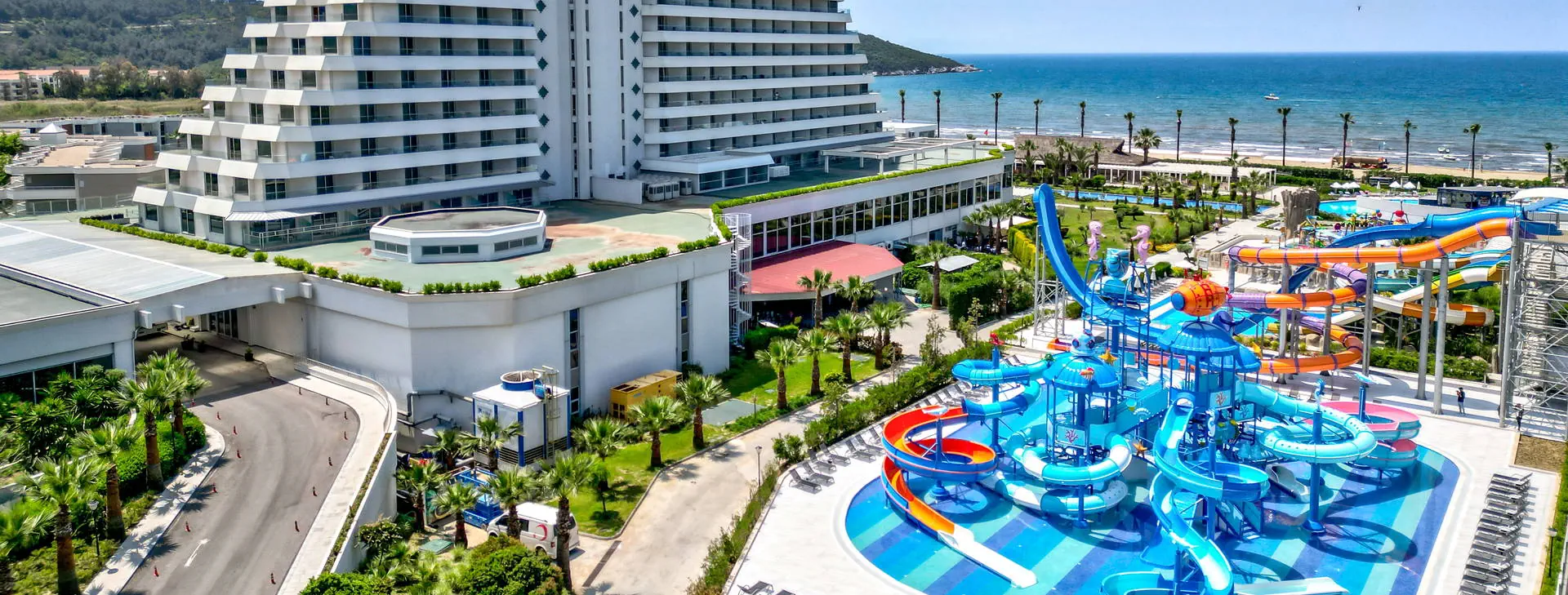 Położenie: Hotel położony jest w zatoce Pamucak, w spokojnej okolicy, blisko atrakcji turystycznych/historycznych. Do miasta Kusadasi z licznymi barami, restauracjami i sklepami oraz szeroką ofertą życia nocnego ok. 12 km, do lotniska w Bodrum ok. 130 km. Plaża: Bezpośrednio przy szerokiej, piaszczystej, prywatnej plaży. Bezpłatne leżaki, parasole i ręczniki plażowe. Do dyspozycji gości: Recepcja 24 h, lobby, restauracja, 4 restauracje a’la carte (meksykańska, włoska, turecka i rybna), 6 barów (w lobby, przy basenie, relax bar, snack bar oraz beer house - dodatkowo płatny ). 4 baseny, w tym 1 ze zjeżdżalniami, brodzik dla dzieci ze zjeżdżalnią. Bezpłatne leżaki, parasole i ręczniki kąpielowe. Za opłatą: fryzjer, lekarz, sklepy. Wyżywienie: Ultra All Inclusive: śniadanie (07:00-10:00), późne śniadanie (10:00-11:00), lunch (12:30-14:30) i obiadokolacja (19:30-21:30) w formie bufetu. Bufet dla dzieci (19:30-20:30). Przekąski w ciągu dnia, kawa, herbata, ciastka, lody, nocna przekąska. Możliwość bezpłatnego skorzystania z restauracji a’la carte raz na tydzień (oprócz niedzieli) po wcześniejszej rezerwacji. Lokalne napoje bezalkoholowe i alkoholowe dostępne 24 h w Lobby Bar. Niektóre importowane napoje w cenie. Za dopłatą: pozostałe importowane napoje bezalkoholowe i alkoholowe, napoje butelkowane oraz w puszkach. Na zapytanie dieta bezglutenowa. Program sportowy i animacyjny: Hotel prowadzi animacje dzienne i wieczorne. Ponadto: tenis, koszykówka, siatkówka plażowa, aerobik, aqua aerobik, tenis stołowy, rowerki wodne, kajaki, siłownia, sauna, łaźnia turecka. Za opłatą: zabiegi i masaże w SPA, bilard, PlayStation, centrum sportów wodnych przy plaży. Dla dzieci: 6 x w tygodniu figloklub z polskim animatorem (od połowy czerwca do połowy września), hotelowy mini klub (4-12 lat), plac zabaw. Internet: Bezpłatny Internet Wi-Fi na terenie całego hotelu. Kategoria lokalna: ***** Strona www: